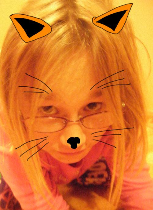 But Cressy the Vampire actually bit the moron cat's big, fat furry tail. Megaroy made a kind of "Mrrrp?" noise that I took to mean, "What the frak are you doing, you little yellow haired monster child?" Then he pulled his tail away and sat on it, with an indignant glare at Cressy the Vampire.