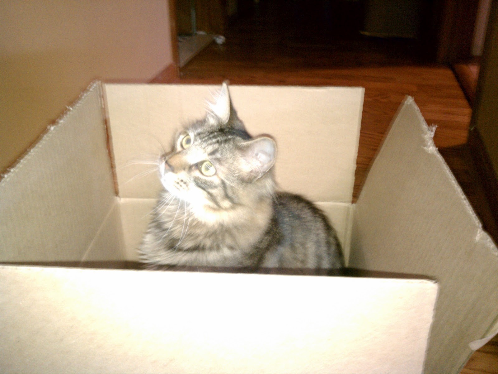 "What box? I don't see a box. I'm too stupid to see a box."As for the moron cat, Megaroy, or as I call him when no one else is home, Dumbass, he's in the box. I take him out of the box. He gets back in the box. I lock him in the bedroom. He makes enough noise to alert the neighbors. I let him out of the bedroom. He gets back in the box. I stop packing and make myself an alcoholic beverage.