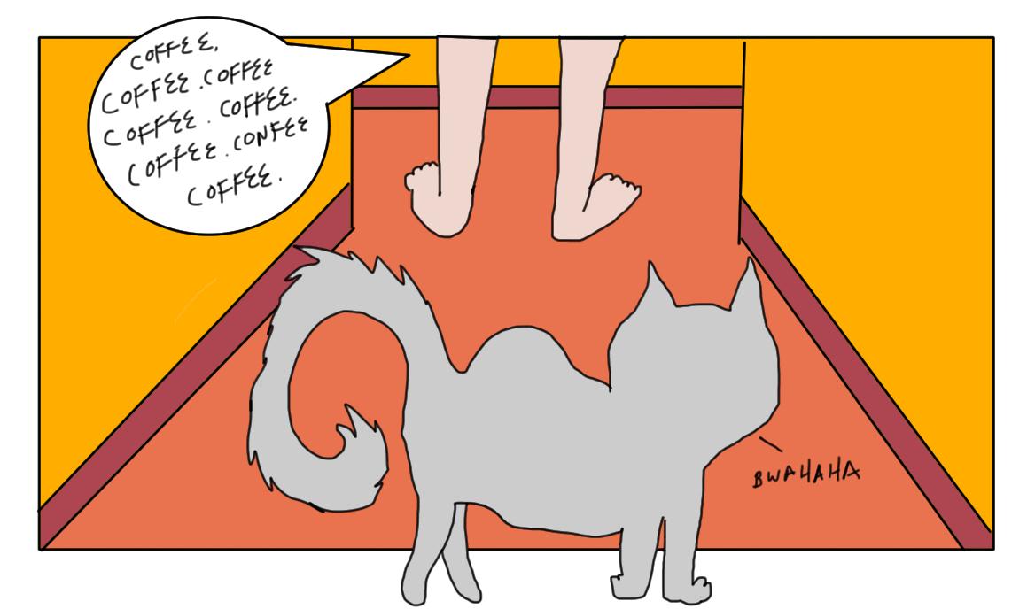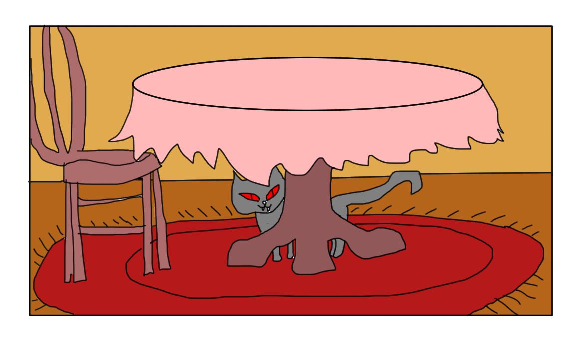 3. Why does the cat ambush my leg when I walk by the dining room table? (He lies in wait in the darkness, under the table, waits for me to pass, and btw, there's no other way to get from the hallway to the kitchen, and banzai! bounces up, wraps his little gray, fuzzy body around my leg, scares the crap out of me, and then zips off.) (I'm afraid to go into the dining room.)