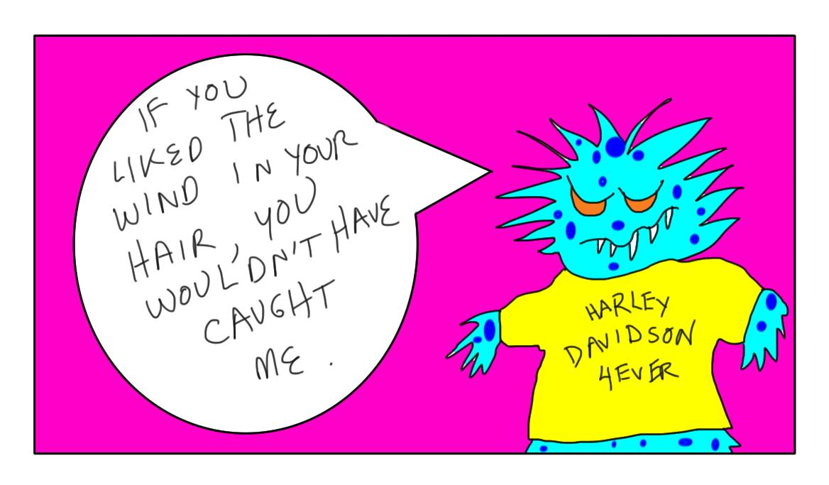I was going for wicked-bad biker germ but I couldn't figure out how to put it in leathers and a little Nazi-looking helmet. But hey only a true bad ass can get away with wearing a yellow Harley shirt.