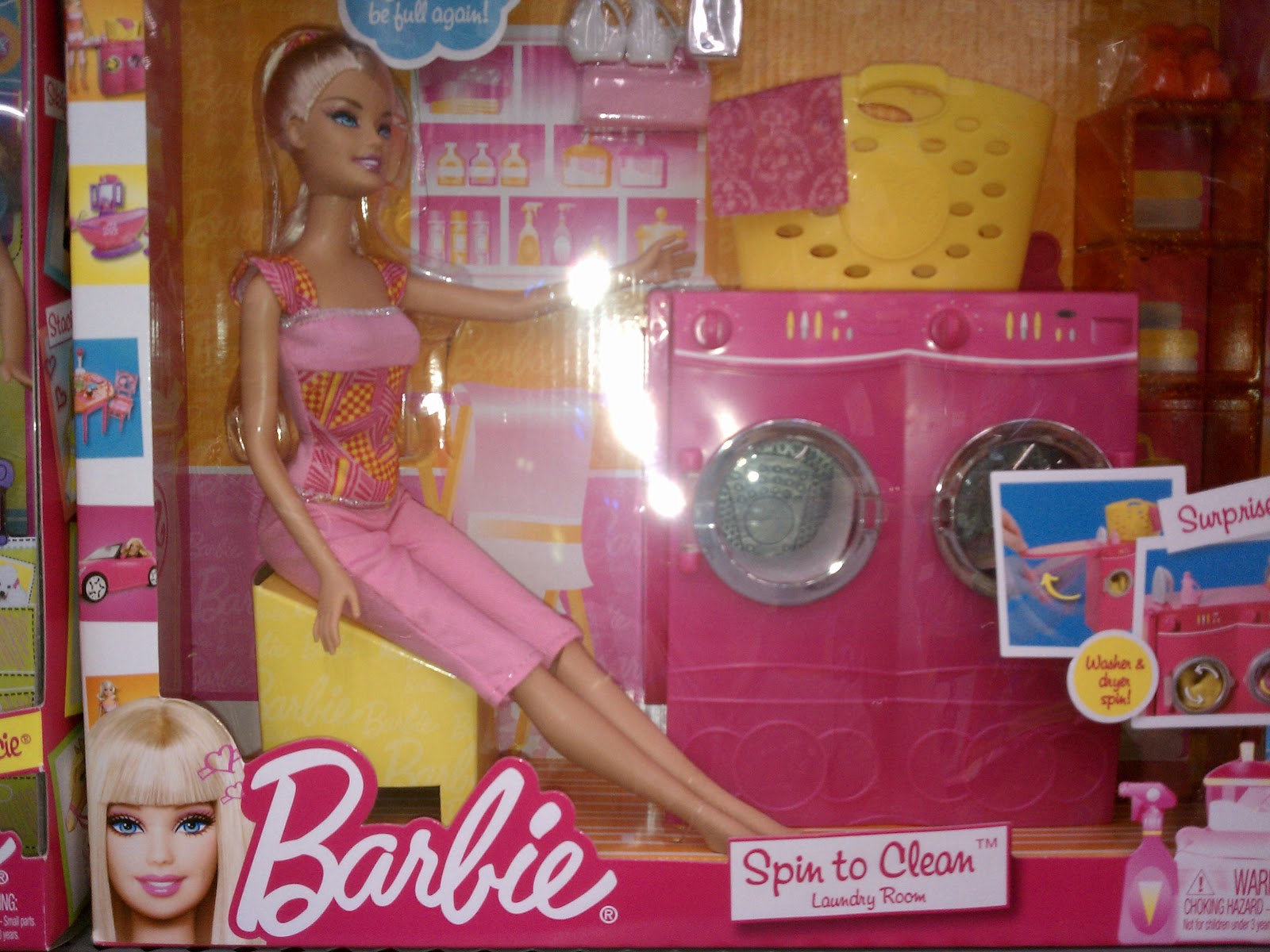 What I'd like to know about the Spin-to-Clean Barbie is why the frick isn't Ken sitting his keister next to the the washing machine and dryer waiting on the clothes to be done? Doesn't Ken have to wash his nasty-ass clothes, too? No, he's got his bitch, Barbie, to do it. Look how happy she is to be waiting for the spin cycle to stop so she can get to work being Suzy Homemaker. See, girls in a nubile state of learning, you too can sit on your tushie, watching your soaps, washing your man's clothing while he earns the dollars. (This one irritated me.) (No, really?) (I have to stop blogging now to go do the laundry.)