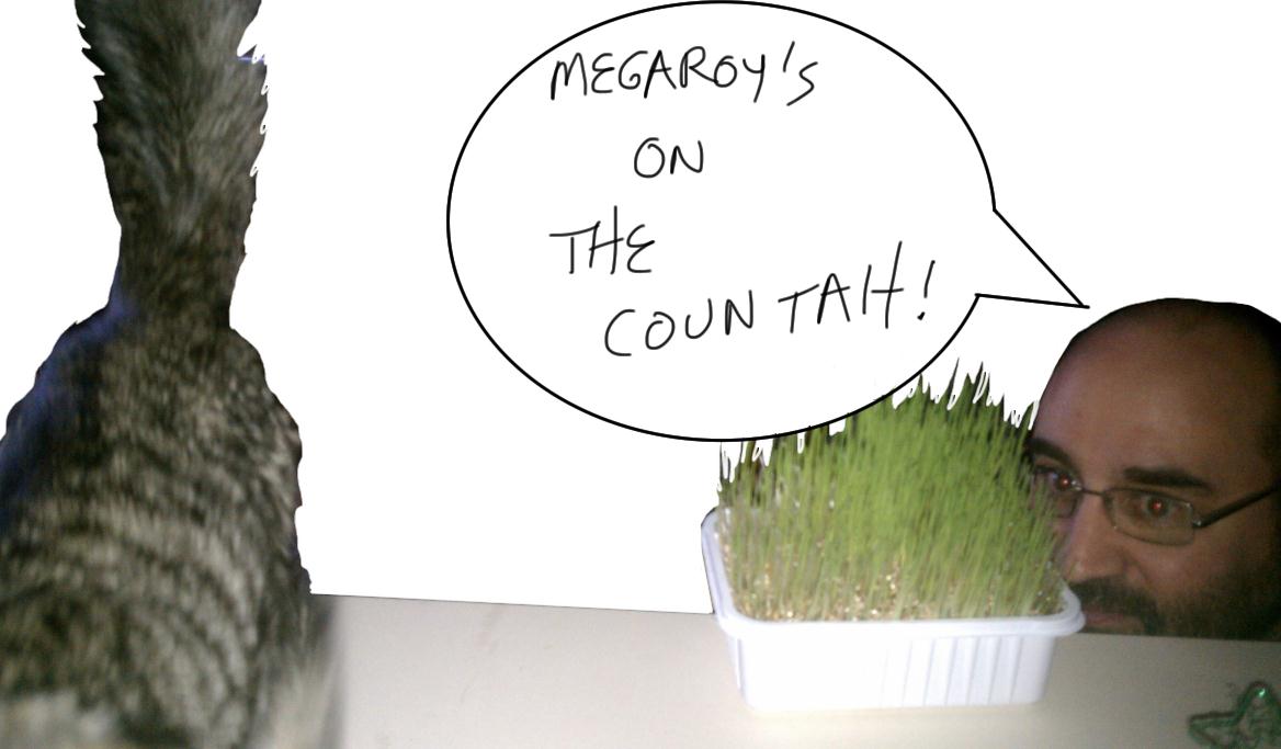I post this blog? Hmm.Eventually the girls lost interest in Megaroy, probably because he wasn't diving through a flaming hoop and dancing on a rolling ball and he hauled ass for his kitty castle, where he could observe the birds and squirrels in relative obscurity. Now he grows a brain cell. Well, a half of one anyway.