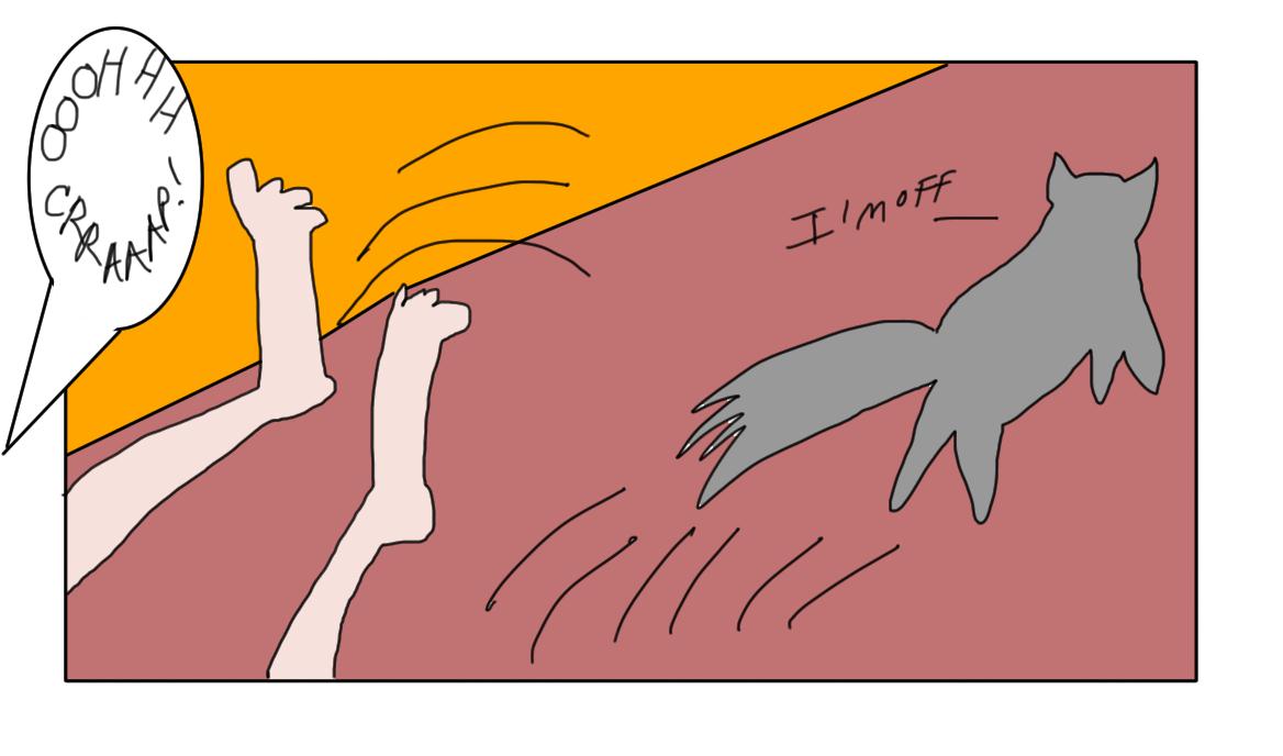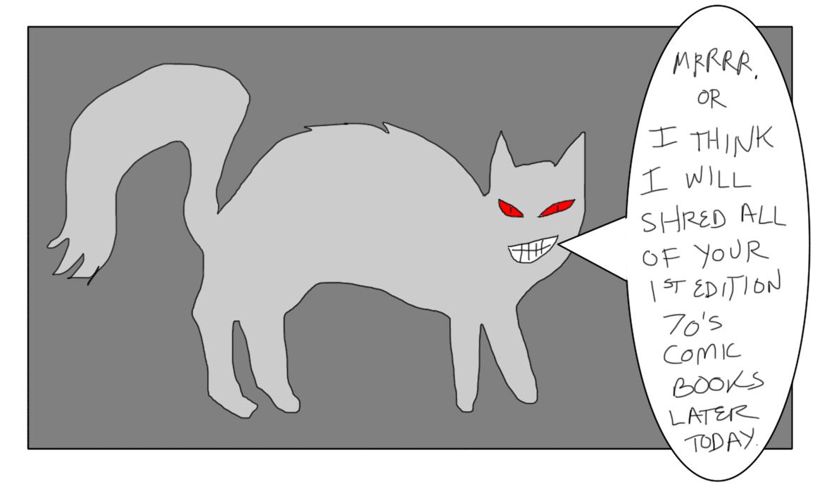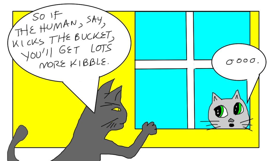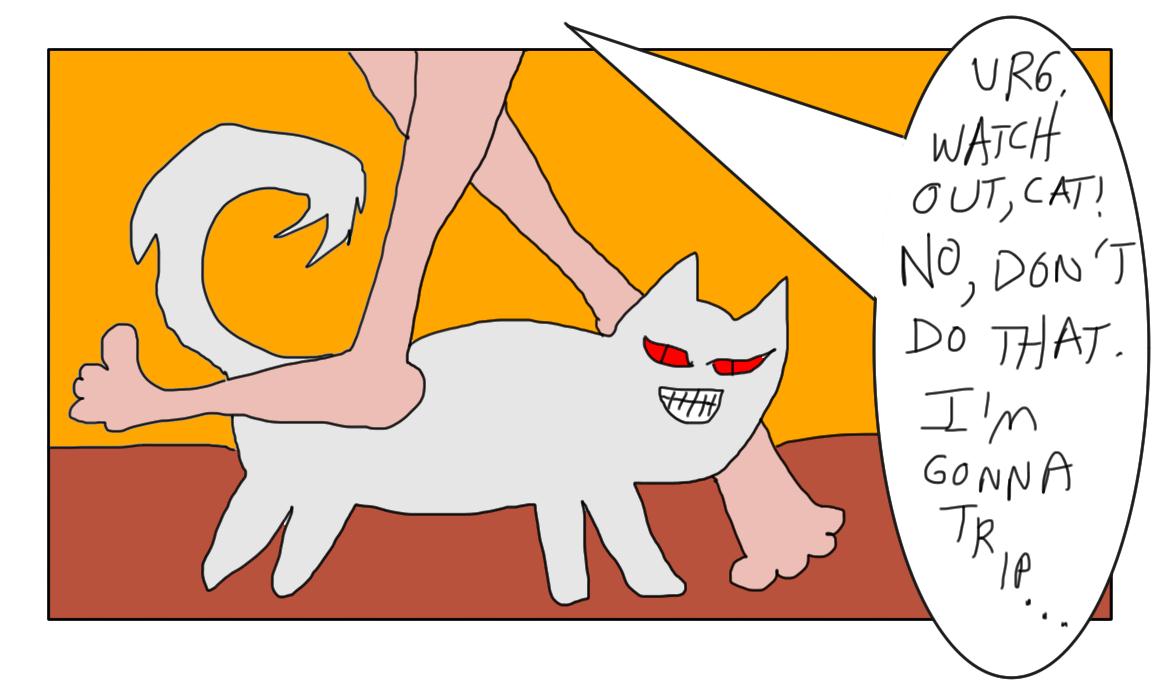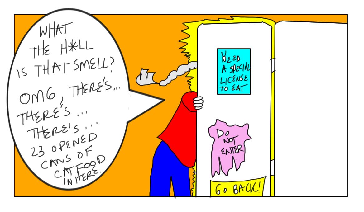 Pain in the Ass Man folded like a cheap suit. He went toward the pantry to get a fresh can of cat food. (Because HIM couldn't look in the refrigerator to see if there was one that was open already. So if HIM had common sense this wouldn't have happened to him.)