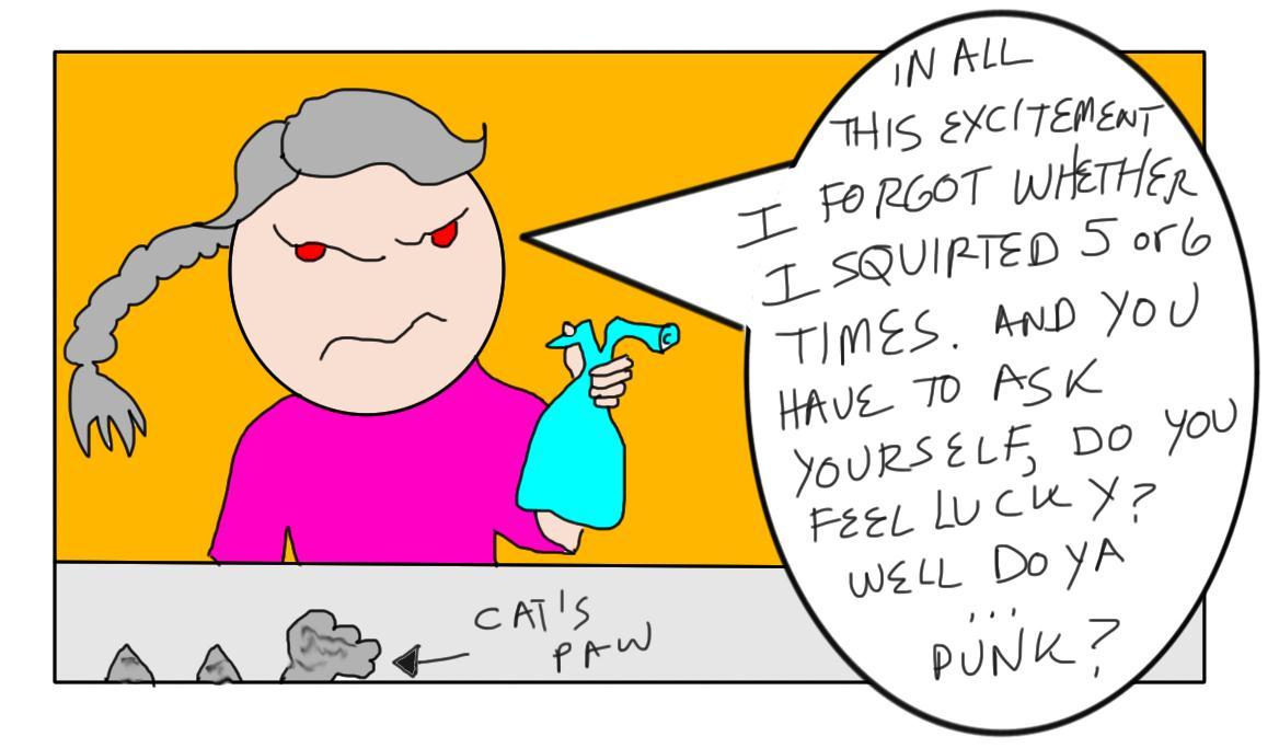 I was forced to buy by my daughter. I was gleefully blackmailed.Of course, I have to squirt him. The kitchen counter is my counter. It belongs to me. It is where I prepare food and cook. (I am not a fat woman because I eat out consistently, after all.) I do not want little gray paw prints and God knows what else, up there every time I've got my back turned. (Which is the lesson Megaturd Megaroy has learned. Don't go on the counter when Fat Woman is about. Otherwise, okee-dokee.)