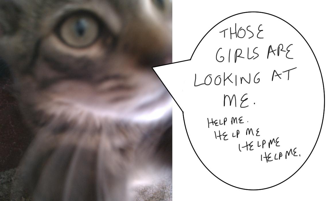 The adoration began. The cat attempted to flee but, hahaha, he was too late. It's a fairly small house and three girls, aged 6, 7, and 8, knew how to hunt down a three pound kitten, who really hadn't figured out how to hide except under the bed, which the three girls cottoned to instantly. (I told him so!)