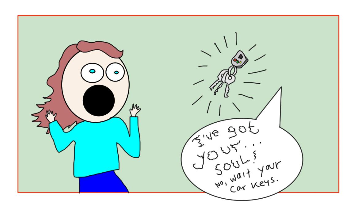 Oh yeah, I'm not Catholic and I wouldn't do that. What would I do? I'd say, "Someone stop giving the cat catnip because he's been on the counters again." I'd pick the keys up and put them on the key rack on the wall. I would not automatically assume a paranormal entity has been effing with my lifestyle. (Maybe the thing just wanted to keep me from driving drunk or something. It could be a well-meaning paranormal thingymabob. Who are we to judge?) I mean, so what if the keys were in the middle of the floor? It's not like they were levitating in the middle of the room with a neon sign pointing to them. And oh, my, I'm forced to do an illustration.