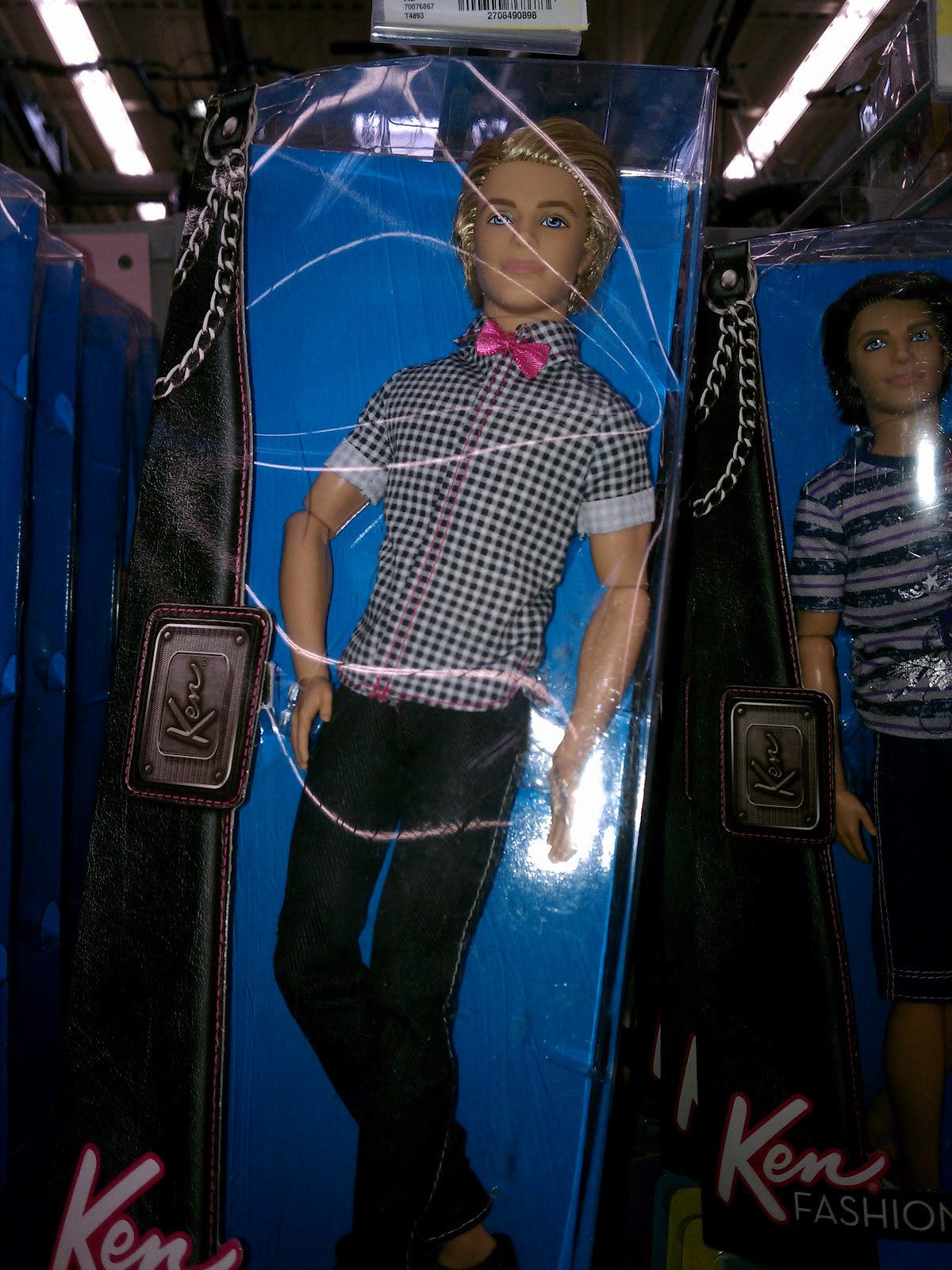 Above is a freaky new Ken doll. In a previous blog I mentioned Mattel's Ken-in-the-Closet doll. At the sight of this one, my thought was, "Who was so retarded that they dressed him in a checked shirt and a pink bow tie?" Either we have bizarre Justin Bieber dolls with plastic hard hat hair or we have Seriously-Flippin'-Nerd-Ken. (This one needs a pocket protector with a protractor or a woman dressed in leather who has him on a leash.) (If I brought a checked shirt home for HIM to wear he would probably take me to the doctor to see what was wrong with me. If I brought home a pink bow tie, then he would divorce me. Just sayin'.)