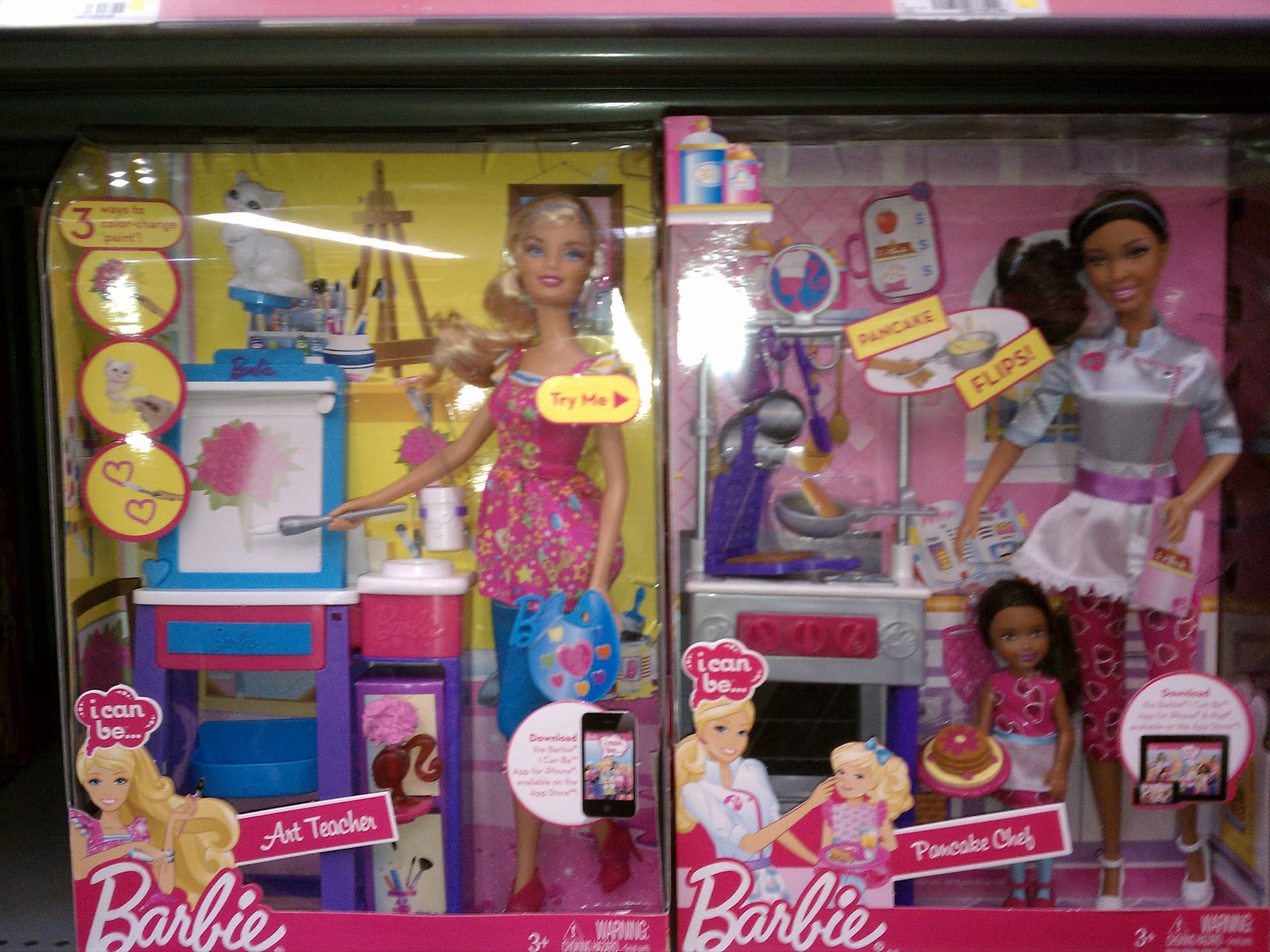 each other.Finally more Mattel selected bigotry. Last time it was the Caregiver Barbie and the Babysitter Barbie, the only difference of which was the color of the skin of the Barbies and the less than titular titles. (I'll leave the rest to your imaginations.) (I had to go and make certain I was using the word, titular, accurately. Then I found there was all these other words with tit in it. Titoism, tittling, titmouse, and titration that I didn't make up. The dictionary amuses me.) This time we have Barbie Art Teacher and Barbie Pancake Chef. And look, OMG, the pancakes actually flip. You too can show your budding offspring how to make money flipping pancakes while the other Barbie gets to lay back and...I'm shutting my mouth now while I'm behind. But you have to see Barbie Pancake Chef has her child there with her in the kitchen because her man ran off with another woman and she can't afford daycare because she's working at that stupid, minimum wage paying job. I'll stop now.