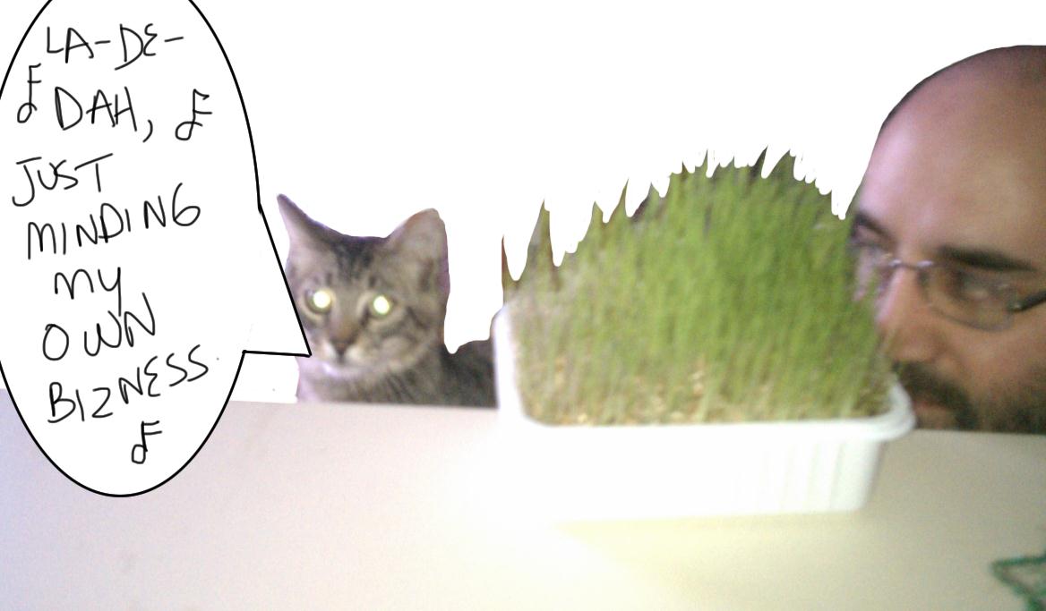 Who knew taking a photograph of the cat was an invitation toget on the counter? And that is a box of grass for cats which