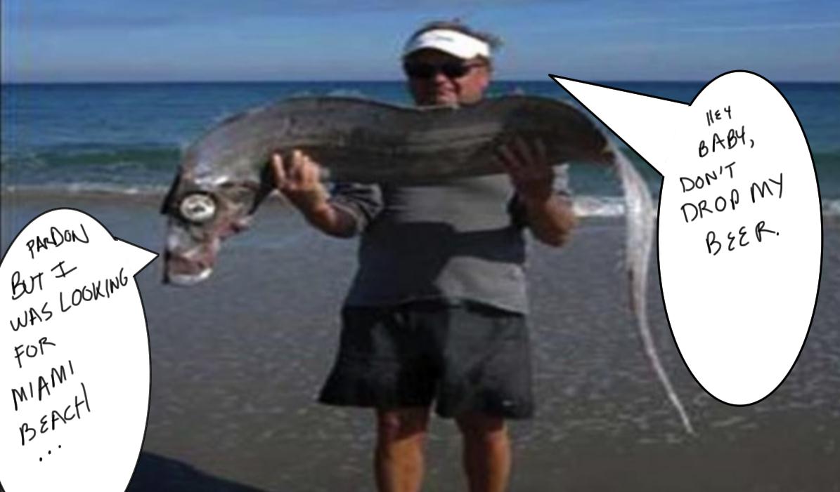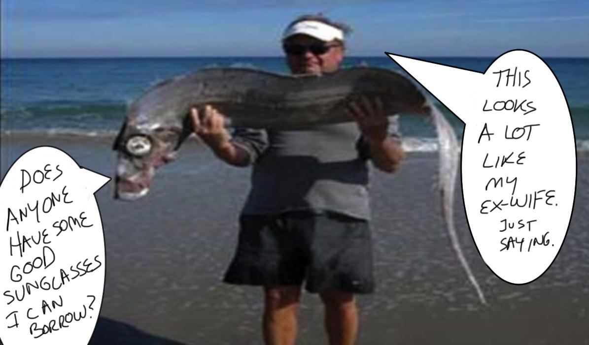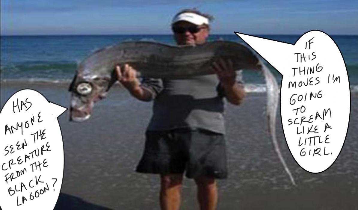 Strange fish found on Beach. Yes, this person, as pictured below, was trotting along the beach and saw this thing washed up and said, "Oh, my goodness gracious googley woogley, there is something really strange. What shall I do? Hmm. Shall I ignore it? No, I can't do that. Shall I bring it to a museum? No, for I am connected to the Internet and think it could be a baby Loch Ness Monster. I KNOW! I shall pick it up and take a picture of it while holding it because nothing from the ocean could possibly be poisonous or possibly still alive to bite me, right, honey?" His significant other, who took the picture and is notably NOT holding the thing, can only have one reasonable response, "Sure baby, is your insurance paid up?"