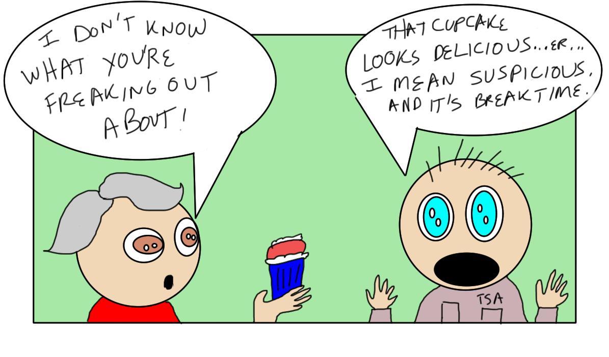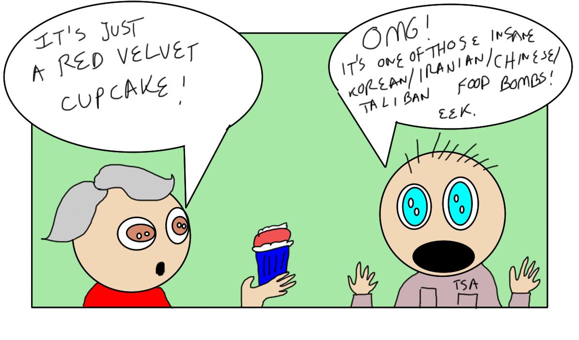 As a fat woman who enjoys a good cupcake, I still can't see the problem. Apparently, the official thought there was enough frosting on the cupcake to make use of the 3 ounce limit of gel-like items. (Two notes here. One is that's a lot of freakin' frosting on the cupcake. And two is how does a TSA official eyeball frosting and equate it to 3 ounces?)