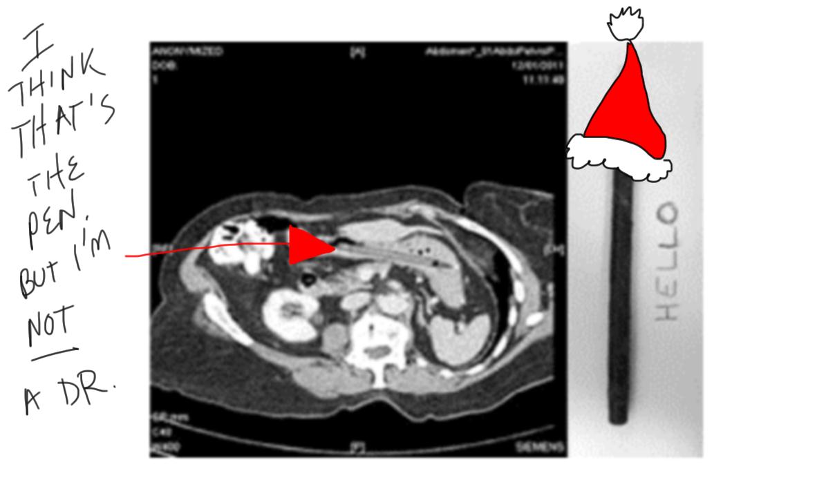 to share with the entire freakin' world.What does this have to do with Christmas? Not a lot, but the story amused me and I did initially bring up the possibility of things shooting out of people's noses. (Wouldn't it have been funny if this woman had sneezed at the holiday dinner table and a 25 year old felt tip pen came shooting out of her nose? Well, probably not.)