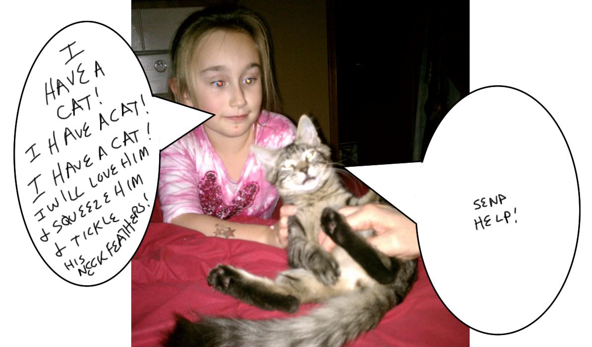 Don't carry the cat like a potato sack.The cat doesn't need a string around his neck, for multiple reasons.Don't shine the laser pointer light into the cat's eyes.When the cat makes that noise, yes that noise, he isn't happy.Yes, the cat's teeth and claws are sharp, aren't they?The cat doesn't need to eat chocolate.The cat doesn't need to eat french fries.The cat doesn't need to eat cheese.The cat doesn't need to eat Captain Crunch cereal.The cat doesn't need to eat (insert various child's food item here, you pick).The cat doesn't need to eat yarn.The cat is running away from you because he doesn't want you to pick him up by his butt.Please feed the cat.Please feed the cat.Please feed the cat.Feed the cat.If you don't feed the #$%^!!! cat I'm going to do something awful.No, I won't tell you what awful thing I'm going to do. I'm just going to do it. And it will be awful. (Taking away the allowance and/or favorite toys for those of you who think I might abuse my child. Believe this is AWFUL to her.)Please scoop the litter box.Please scoop the litter box.Please scoop the litter box.Please for the love of St. Peter, scoop the litter box.I'm going to put the litter box in front of your bedroom door so you have to step around it every time you come and go, so you'll remember to scoop it.(To HIM, the man to whom I'm married and who recently revealed to me that he's been secretly coaching our daughter to ask for a frickin' cat for the last six months. "Tell Mommy you want a cat." "Tell Mommy about the cat again." "Yeah, Mommy's had a rum and coke, get her now.") No, I didn't remind our daughter to scoop the poop for the fiftieth time. You do it. (This was dripping with sarcasm, in case anyone missed the implications.)(To HIM, who laughed about his furtive need to also get an effing cat.) I wonder if the litter box scoop would fit into a certain hole in your body.(To HIM) The cat's farts smell like decomposing corpses.(To HIM, who gets up at 5:15 am and the cat has decided he shall get up with HIM and therefore, EVERYONE in the house should get up, as well.) I hope something integral rots and falls off, you rat bastard. (Not really, but it sounds good when I'm cranky because I've gotten less than my normal amount of sleep due to a three pound lump of fur sucking up the majority of my side of the bed and caffeine hasn't magically been introduced into my blood system upon arising at 5:20 am.)(To HIM in a whiny voice) Why can't the cat sleep on your side of the bed?Anyway, the cat's going to want revenge one day. Just sayin'.
