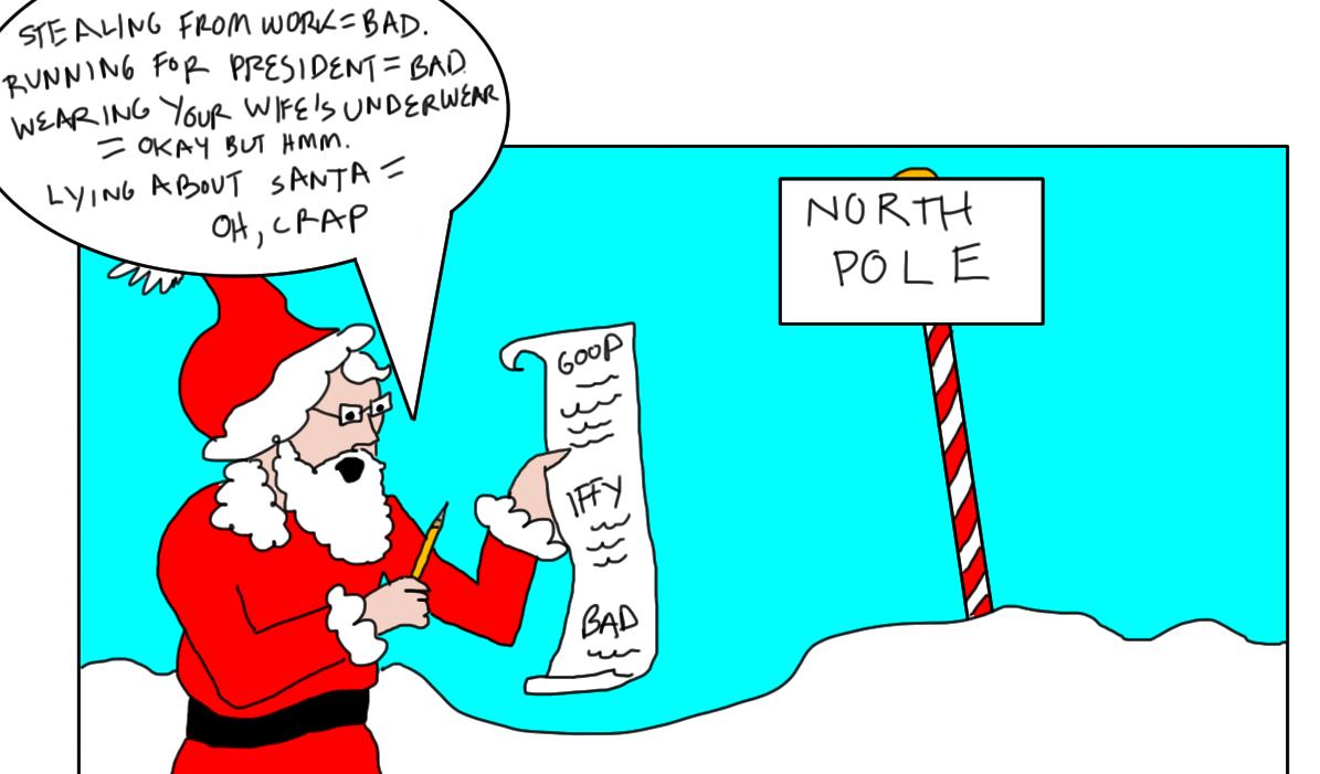 Oh, we're going on the naughty list. It's a conundrum. We're 'supposed' to lie about Santa Claus, but if we lie then we should get coal in our stockings. Right? You think Santa sits at the North Pole trying to figure out who was telling the 'good' lies and who was telling the 'bad' lies?