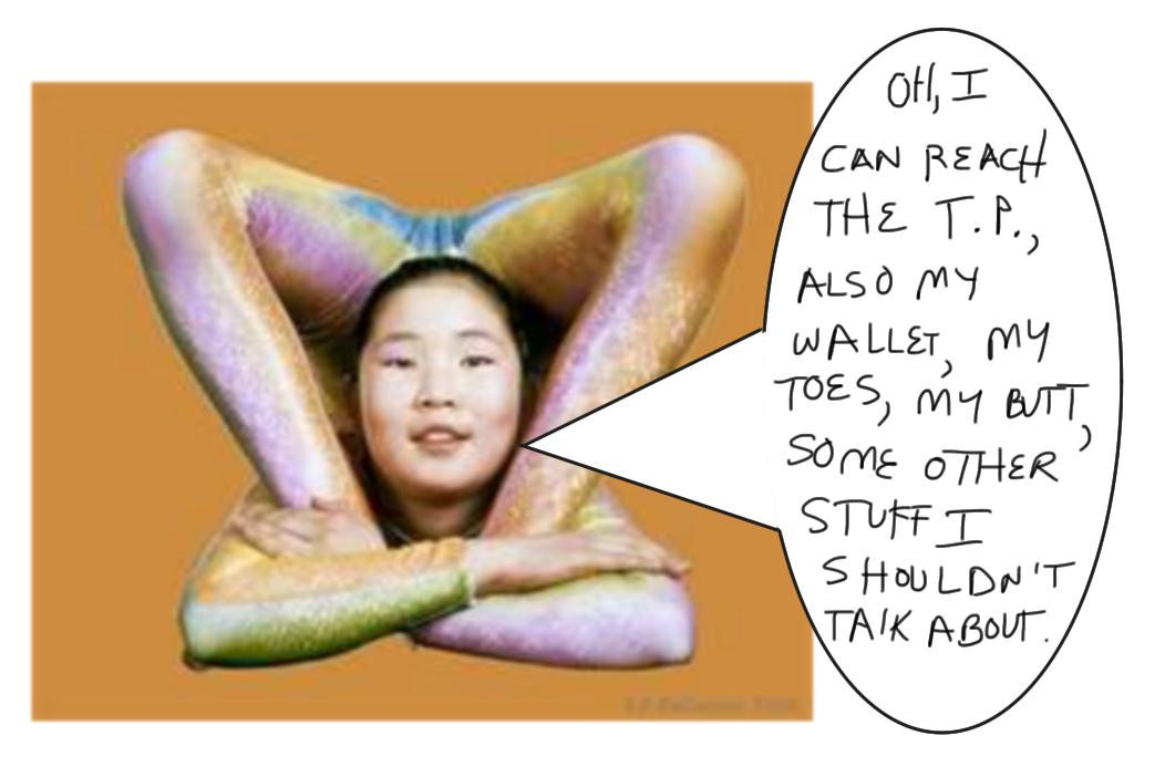 Okay, nothing to explode about, right? But then HIM takes the toilet paper when HIM's done and puts it on the back of the toilet's tank lid instead of back on the holder. The next person in the bathroom may or may not see the toilet paper out of reach and sets about her bathroomly business before realizing there is NO LONGER a roll of toilet paper on the holder. The toilet paper is NO LONGER within reach of anyone except a card carrying member of Cirque du Soleil. (The contortionist who literally CAN kiss their own tushies.)
