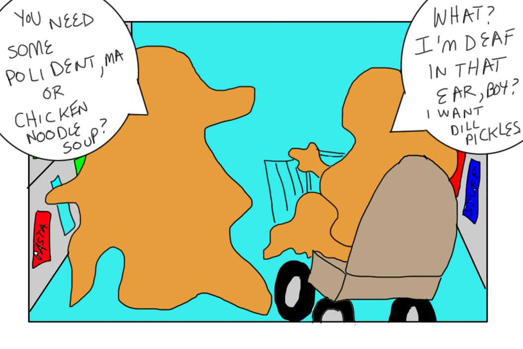 I went inside and shopped. Half of the time I was behind a woman in a motorized wheelchair/cart and her son hauling another cart while they sprawled over every section of the canned/nonperishable aisles that I wanted to go. If I wanted Pop Tarts, they spread over the aisle like two forms of giant gelatinous goo-people and their conversation went thusly: