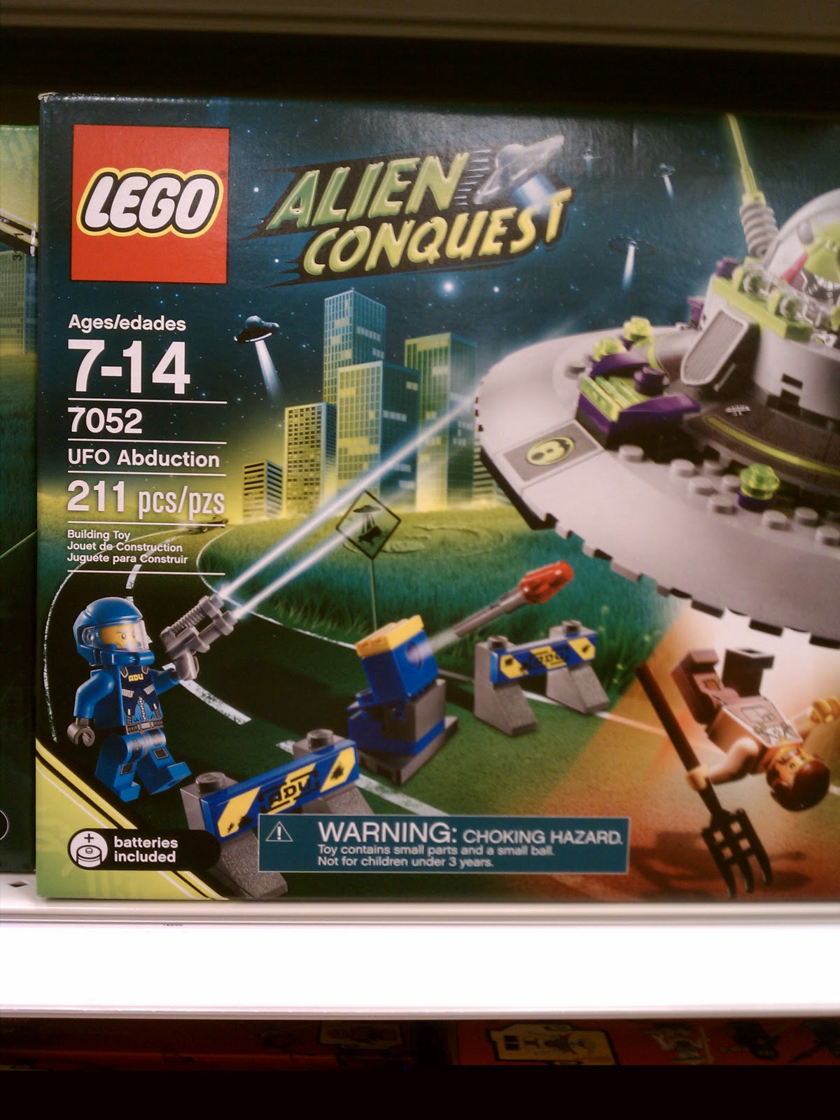 We were in the Lego aisle. Lego's loomed at me from all sides. There were Toy Story Lego's, Star Wars Lego's, Atlantis Lego's, Lego's that I didn't give a poop about, and then there was the Alien Invasion Lego's. I cannot help but wonder what wondrous brain came up with this one? Was this sterling example of toy inventiveness perhaps also the owner of an aluminum foil hat? Wait, there's more because even Target noted something about this set that I did not.