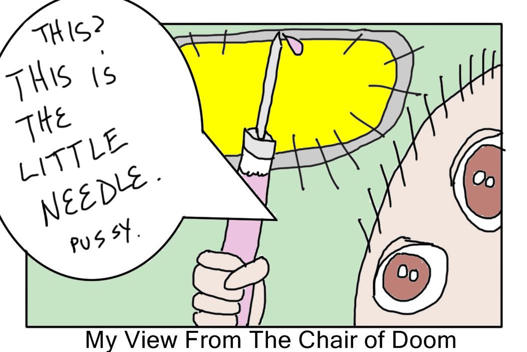 Junior dug around for a few hours with the needle. (It might have been thirty seconds.) He pulled back, got another needle, which looked bigger than the first one and hummed while he waited for the first batch to start numbing me up. Not sure what he was humming but it had a rhythm and you could dance to it. (I was concentrating on the pain in my jaw.)
