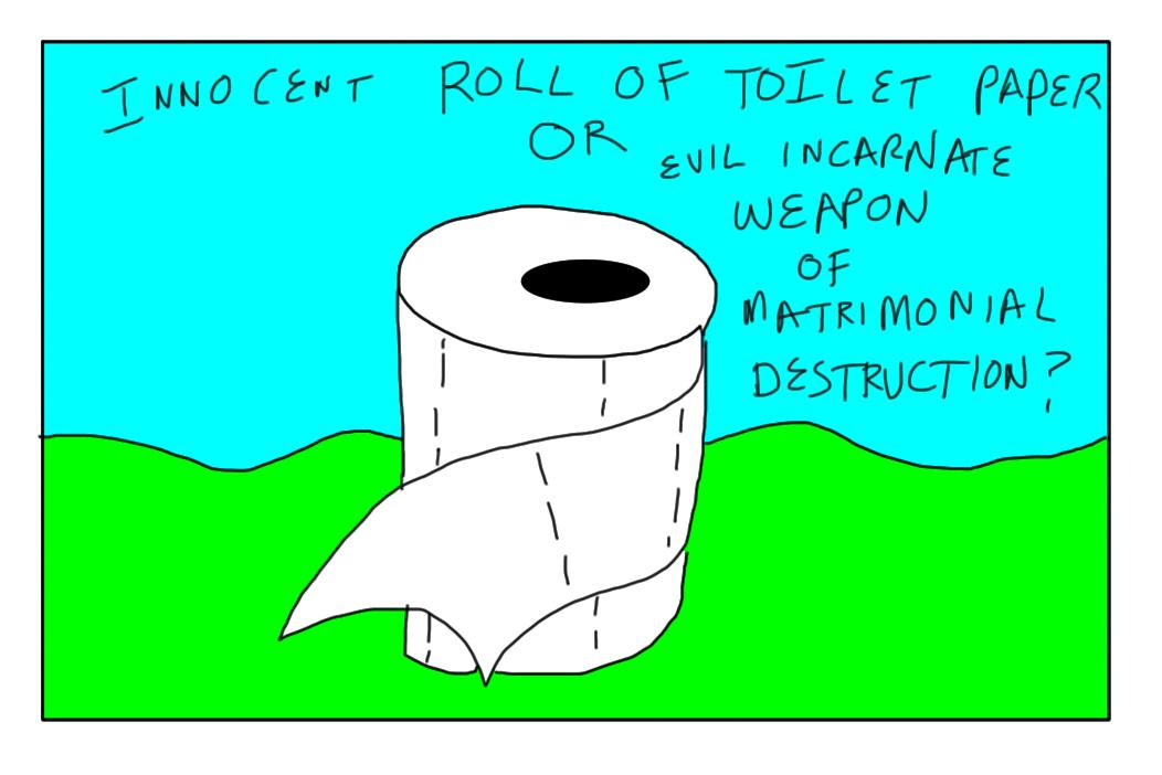 I believe I've already mentioned HIM's preference for having the paper go over the top of the roll whilst hanging on the holder. Well, once HIM invaded my bathroom, HIM simply took the roll off the holder in a blatant attempt to avoid the over or under theorem. Why? It's a small bathroom and HIM says, "I can't reach the holder when it's right there 2 inches away from my elbow." (Craftily, HIM avoided the over or under bomb by utilizing the whole removal of the TP method.)