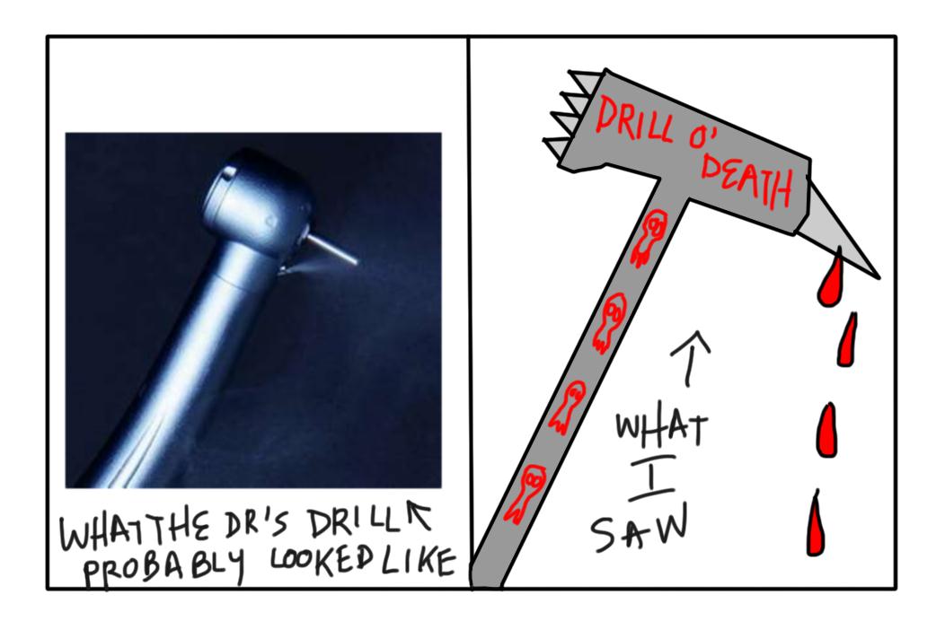 I was too busy trying not to swallow that I got this foul taste in my mouth from burning tooth debris that I very nearly yakked in the dental chair. Now while it's true I don't like the dentist, (It's true.) I've never actually had to keep myself before from barfing on an office visit.