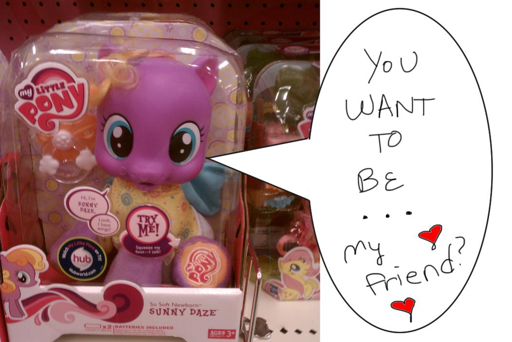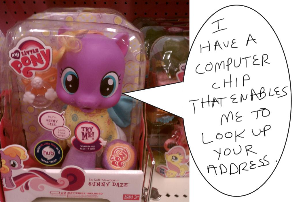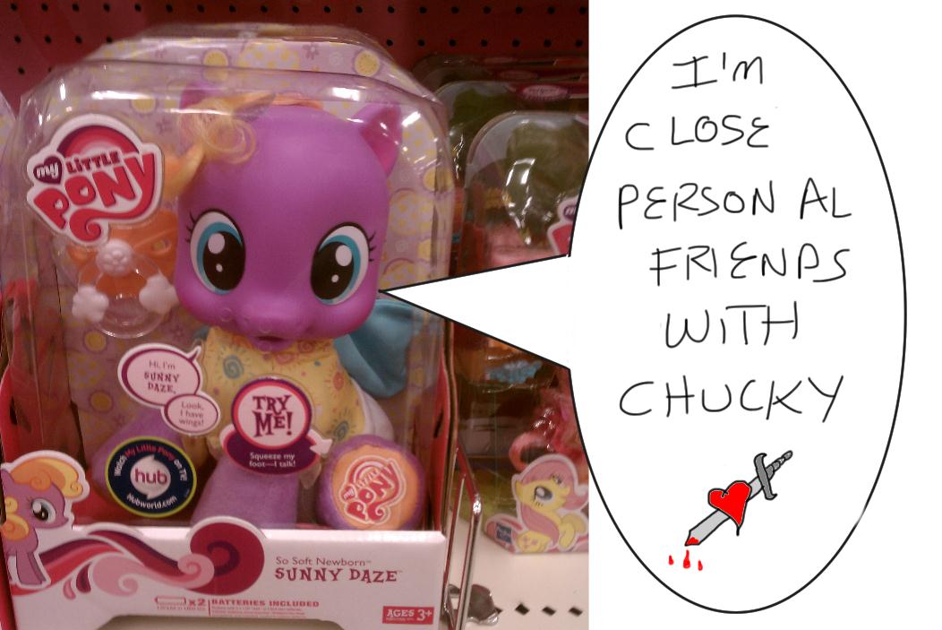 They should call this My Little Creepy Pony.You don't think it's creepy. I didn't push any of its damned buttons. I just set off some kind of motion detector and it said something really loudly, causing me to nearly lose control of my bodily functions. This is what it said. Really, it did say this:[image error] And it had a creepy, little, Hannibal Lecter voice, too.As I walked through the Barbie Doll (and closely affiliated knock-off) aisle, it's little beady eyes followed me.