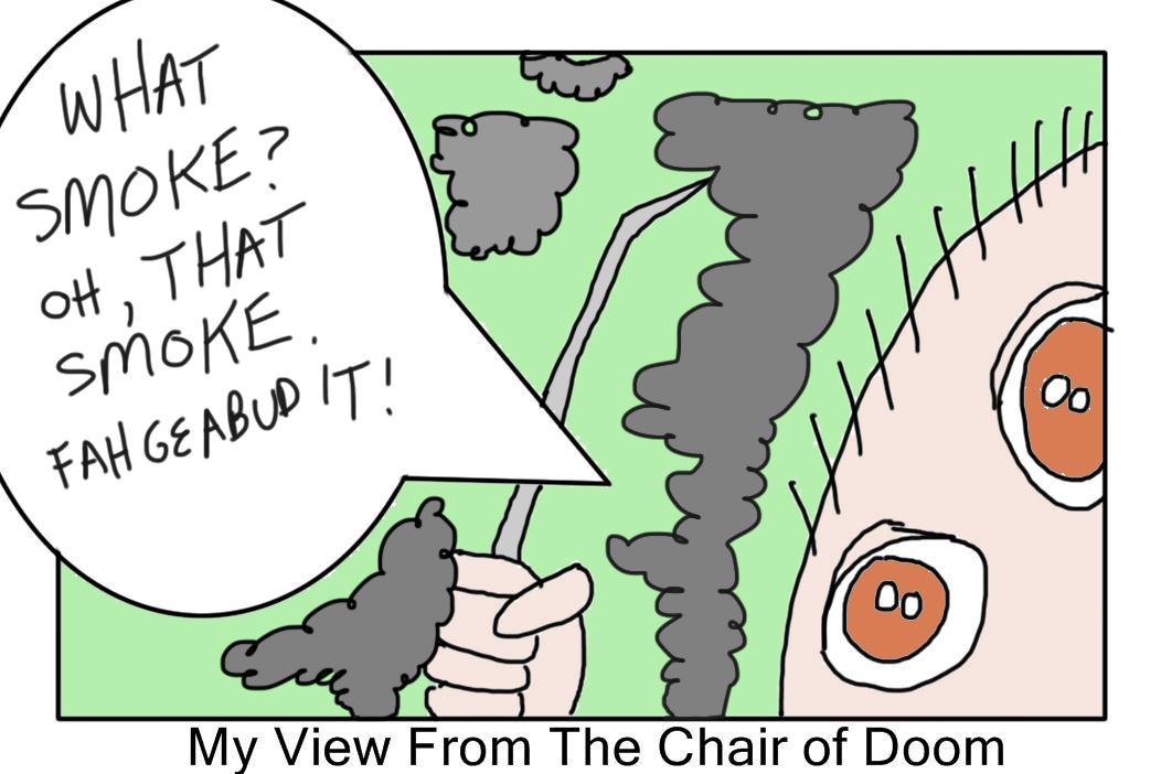 Cue the burning dog hair smell. This is always such a fun part of the visit. I could see (I could!) smoke coming out of my mouth and it wasn't the good kind of smoke like when you just took a hit off a doobie. (Not that I've done that for twenty-five years. I swear.) Seeing smoke come out of your mouth is rather alarming when you haven't done anything that would normally accompany such an event. Plus it goes right past your nose and you can't help smelling it and it does not smell good.