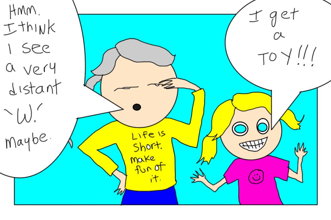 Her: "Oh, I don't know. Let me look at that box. Wait, I have to find my reading glasses. Where are my dagnamed reading glasses? I had them in my pocket. Are they in my purse? Where's my purse?"