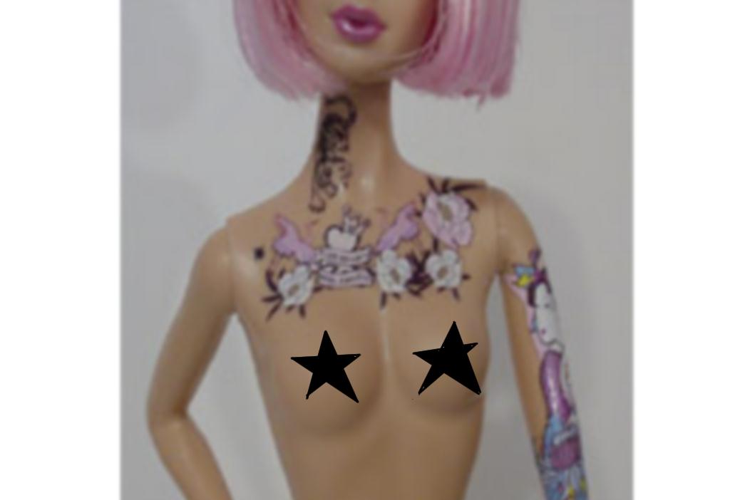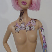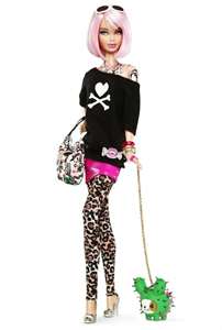 HOLY SHADES OF YAKUZA, BATMAN! Naked Barbie boobies! (Kids, look away from the anatomically incorrect boobie lumps.) Finally, here's a Barbie I didn't see at Target. I read about it and HAD to include it in this blog. Apparently, this special edition Barbie is somewhat provocative because of her extensive body art. She's called the Tokidoki Barbie and initially sold for $50. Fortunately for me she's all sold out and is going for about $400 on eBay. Here she is with her clothes on. Pink hair and all and funky little dog/thing. (Is it a cactus costume? I do not know.)