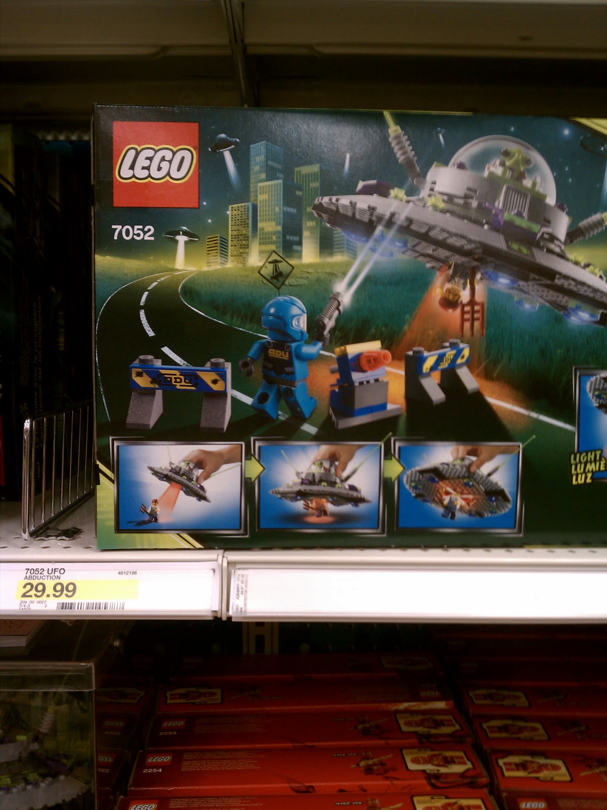 Yes, right there next to the 29.99 it says Lego ABDUCTION set. It's on the little label attached to the metal shelf. You see, even Target knew something was amiss and labeled it accordingly. (And by God, it says UFO Abduction on the front of the box. See the first photo.) See those pictures on the box. It shows a little Lego figure being abducted by the alien ship. Just like that. So much for aluminum foil hats, suckers. (HIM commented that this set needs duct tape and clothes line for authenticity but what I really want to see is the little tool the Lego's people came up with for the aliens to use for probing.)