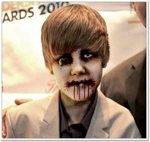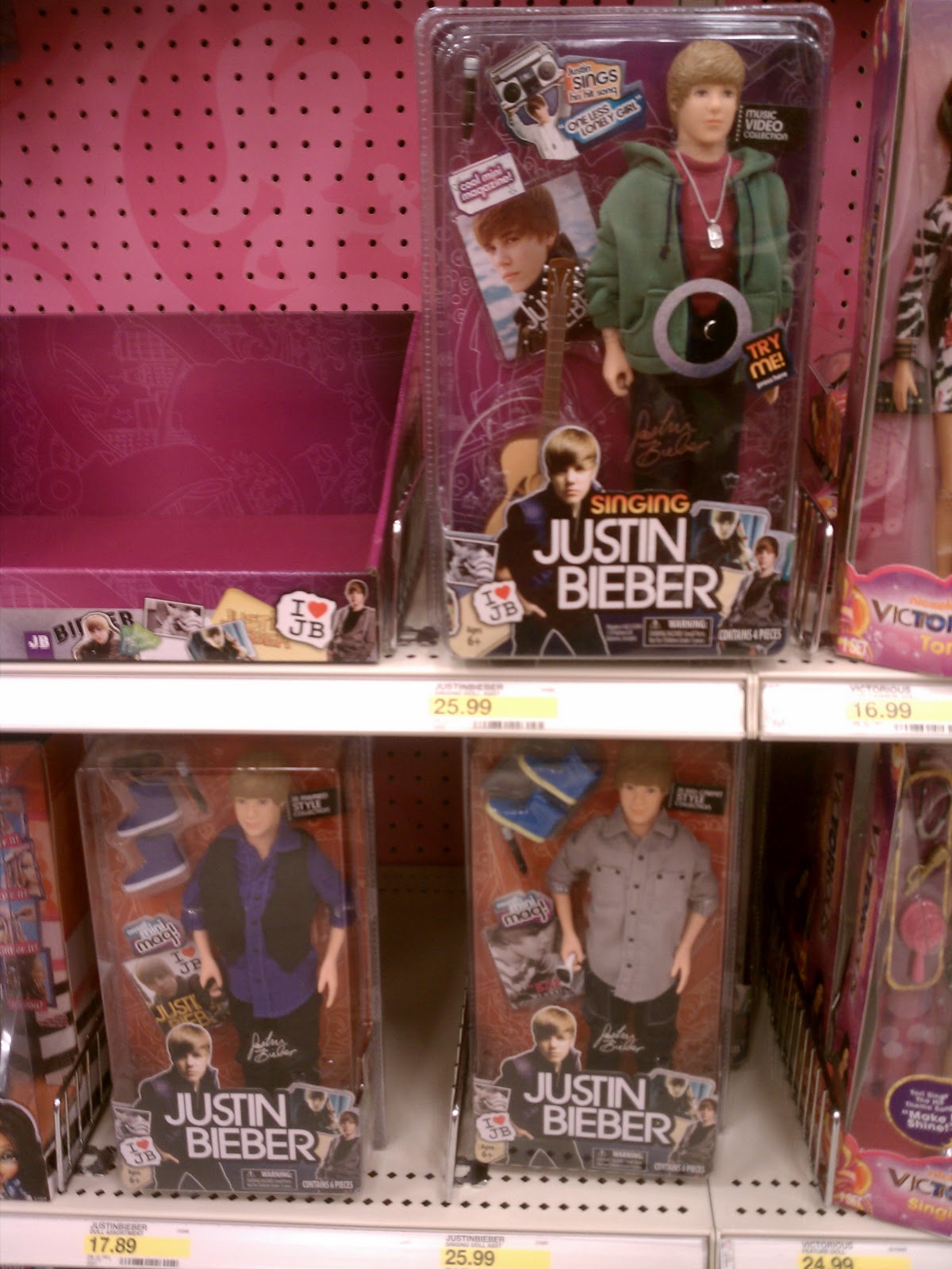 And this is Barbie the Baby Sitter.I'd like to point out that except for the names, Baby Caregiver and Baby Sitter, the two items are almost identical. The other significant difference is the skin color. If I were really pissy, I would say that only Caucasians get to be caregivers while darker toned skinned Barbies get to be lowly Baby Sitters. I suppose it's really a matter of whether one believes that caregiver is a more socially conscious name than baby sitter. Personally I think it sends a shitty message. Fortunately for me, Cressy wasn't really interested in this one. (Or else I would have barfed there in the aisle at Target and the clerks tend to get ticked off when that happens.)But wait, there were more exciting dolls to look upon. Cressy now knows who Justin Bieber is and she was looking at his doll, too.