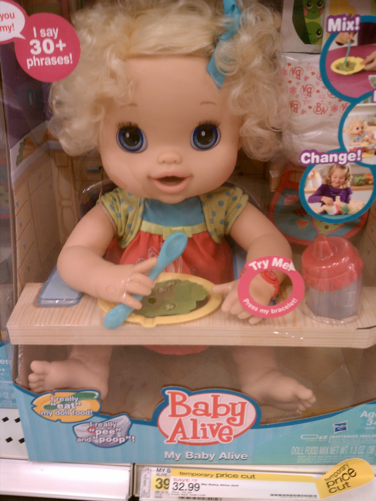 This baby is from the truly creepy line of babies who talk to you. I want to point out on the package on the lower left it says, "I really eat my doll food," and ickily, "I really 'pee' and 'poop'!" OMFG, the doll comes with packages of "food" that the proud owner feeds to it's Chuckiness (that's a demonically possessed doll missile aimed at the toy industry) and there's a photo on the back showing the baby-puke-green colored crap that comes out of its odd, teensy, butter bean, plastic butt. Isn't this just the funnest doll ever? (I remember having a doll that one fed water to and she peed out the same water about a minute later, but how do you clean the insides of this craptacular piece of child merchandising?)