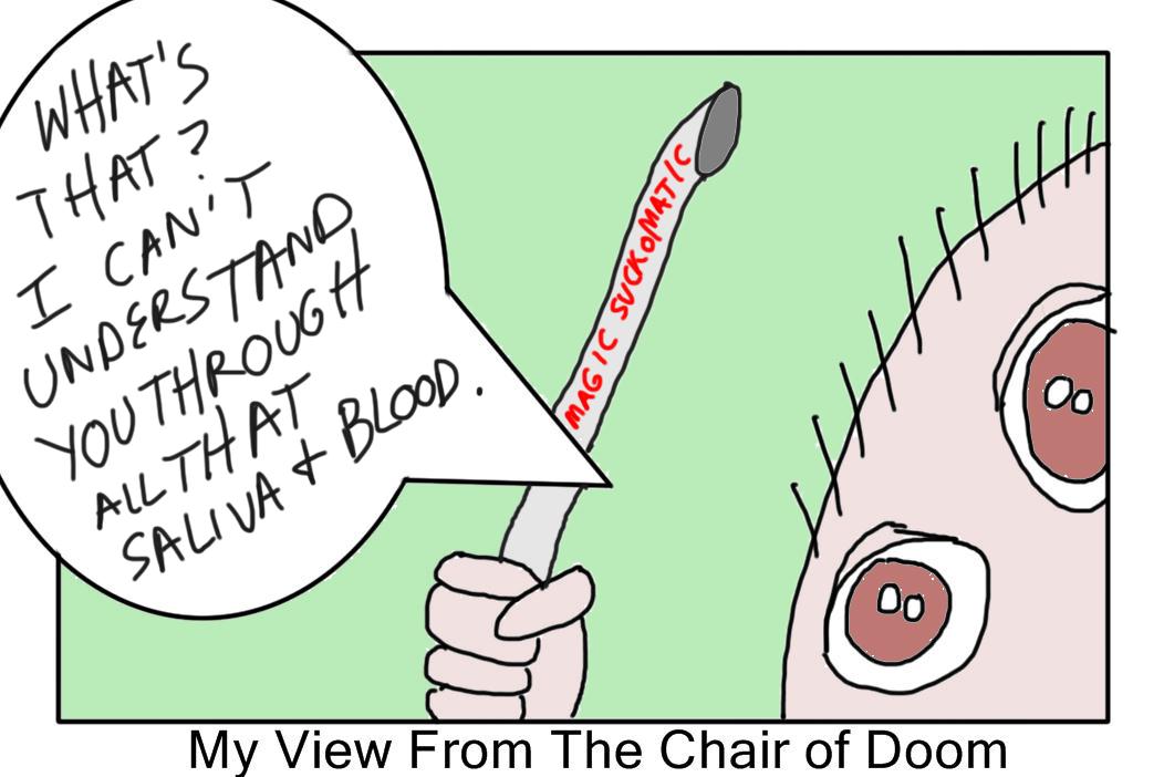 And for some reason Junior didn't have a handy assistant with which to suck out my accumulating spit. So occasionally he had to stop and vaccu-suck my mouth. I would have signaled but I was busy trying not to drown.