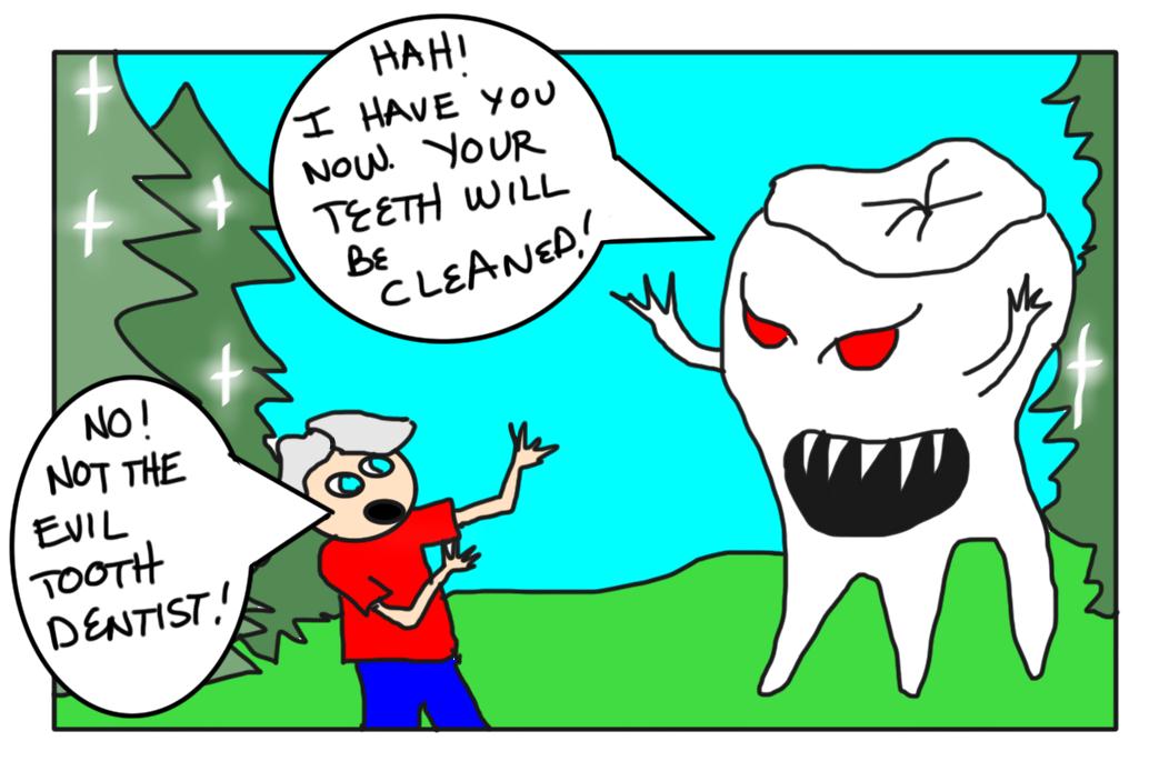 I imagine the evil dentist as a giant tooth. Look howwhite he is. (This is kind of like having a mascot