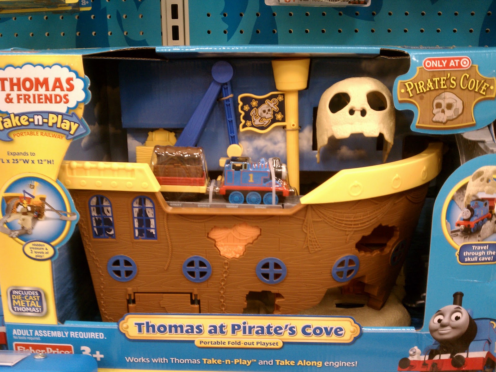 As this picture clearly illustrates, we wandered though ALL of the toy aisles. I didn't go willingly. So when Cressy was about three years old she would watch Thomas the Train as it drove about the island and did strange train things and made bizarre train faces. Therefore, I cannot fathom how a talking, creepy-ass train gets on a pirate ship. Well, I suppose it's weird that the train talks to begin with, but let's just take it to the next level. Thomas the Pirate Train pillages the Spanish Main. The toy maker's response: "Hey, it works for three-year-olds AND we can sell more toys." I can't help but notice that Thomas the Train needs a big, freaking life vest 'cause when the pirate ship is sunk by Her Majesty's Navy, he's going to the bottom like a freaky-faced, train shaped rock.