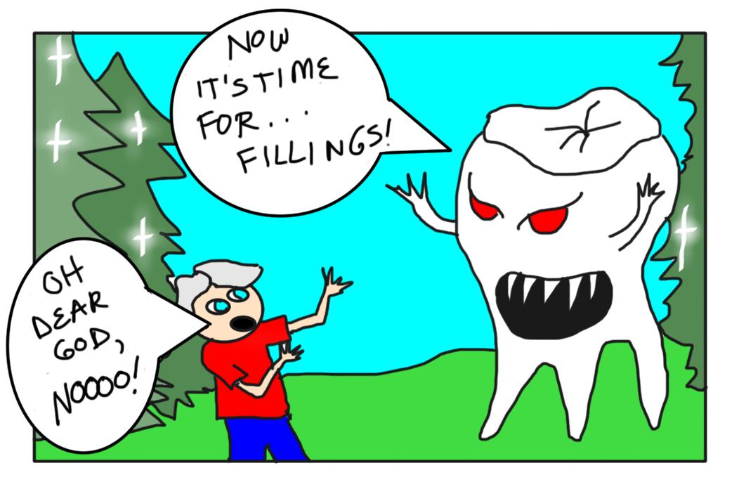 and my brain.)The dentist said, "You have two cavities. They must be filled. You will come in next week for the ritualized maiming and torturing of your mouth for this cataclysmic event." (No, he didn't really say that, but it was implied. You know, people often say things to me that are implied. It's implied that it's implied. If you understand that, you're a very special person.)