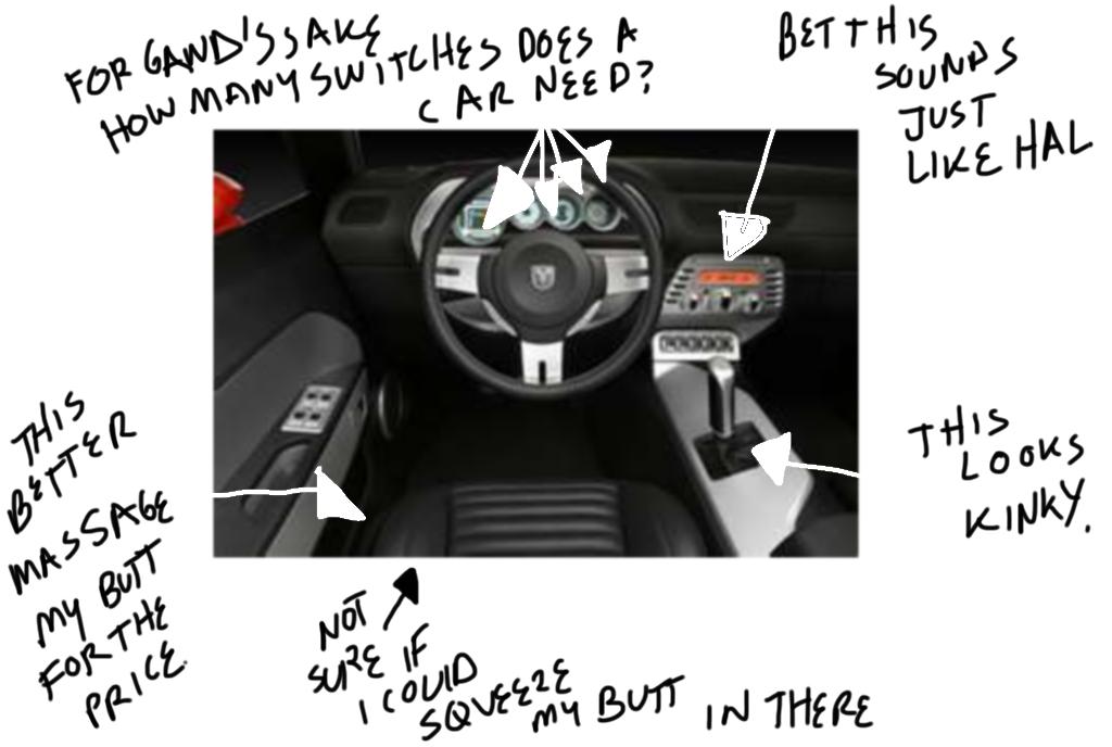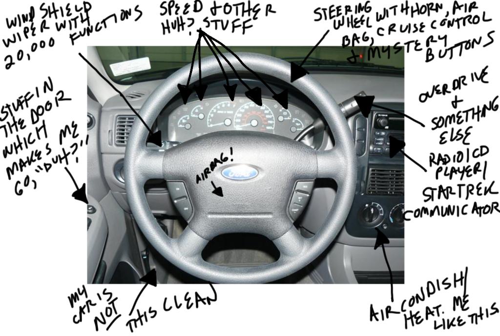 I look at this and make grunting sounds. Fat Woman drive car.Good. Grunt. Snort. Snoggle.You know, it occurs to me that one day I'm going to press a button and it's going to be a seat ejection unit. I'm going to be launched out, just like Bruce Willis in Die Hard 2. Oh, wait, I've been inspired to do an illustration for effect.