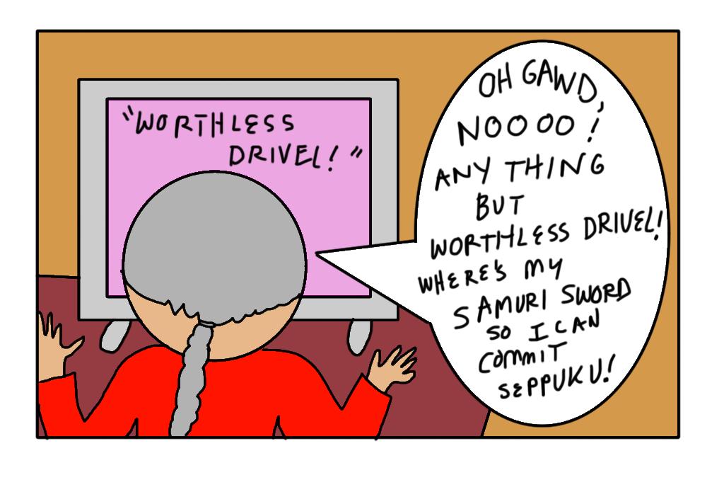 My initial reaction to 'worthless drivel.'I'm honestly touched that someone felt so obligated by a free download that he had read to come back and write five words about it. Five whole words. Those words must have been torn from his tortured psyche. So what did I do? I went to all the digital platforms and added the following to the description of Bayou Billy. Warning: May contain poopoo language for those who are easily offended. There may be worthless drivel contained inside. What can I say? It's my description of my book. I can write what I want about it.So HIM just texted me and asked what I was doing. I replied that I was writing worthless drivel and couldn't be interrupted. HIM naturally interrupted with, 'Garbage? Utter garbage or just worthless drivel?' This, of course, prompts me to go off on yet another tangent. God, I love those tangents. They make life so darned interesting.
