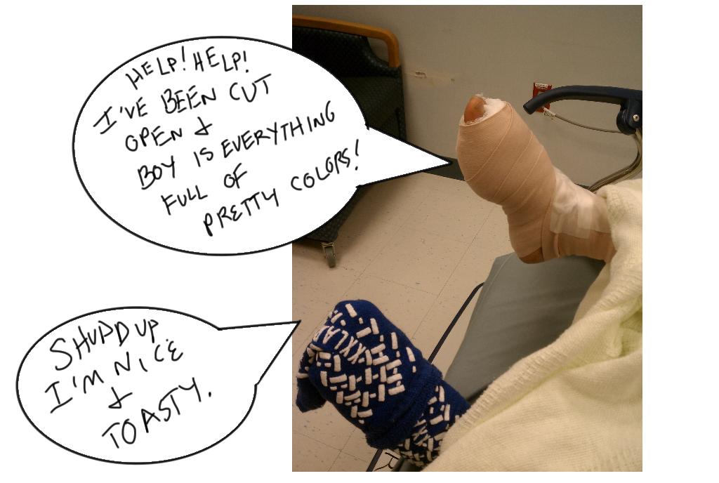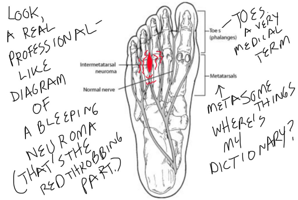 This is HIM prior to having foot surgery. Haha. I love my autodesk sketch program.A neuroma is: A) A neurotic disorder of the limbs causing one to inadvertently kick other people in the butt whenever they're being stupid and/or silly. No, wait, that's me. B) A rare type of meatball dish which is covered with noodles, peas, and pig's intestines sauteed in a light butter cream. C) An odd game played in Turkey by goatherders using rocks and other men's testicles.