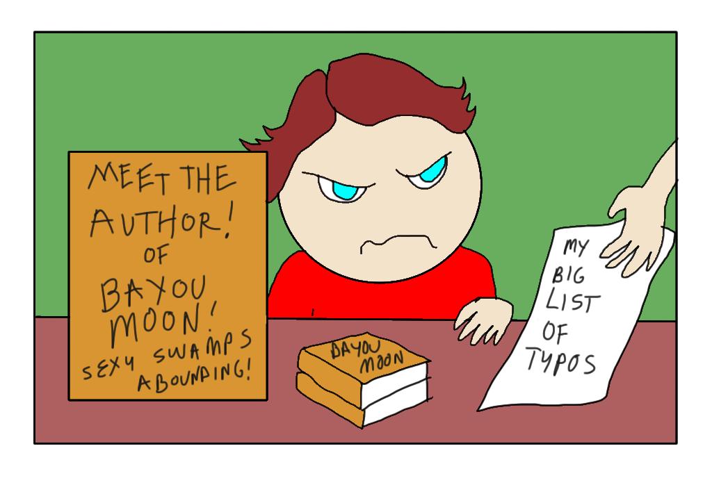 Now I'll tell a typo story. The first book I ever sold was Bayou Moon. I've written about it before. It's a Gothic mystery set in the south. (I should hope so.) I sold it to St. Martin's and it came out in hardback. Then I went around promoting the heck out of it. I must have read that sucker twenty times before it got published. Then there was my editor who must have read it twenty times too. HIM, the man to whom I'm married, read it multiple times. Several friends and relatives read it. Then there was a line editor who tore it apart with a red ink pen. Sounds like it was proofread, right? About a month after the book came out I was doing a signing in Plano, Texas when a lady came up to me with a list. She said, "Here's a list of all the typos in your book, dear. I made note of them so you can change them in the future." Wasn't that nice of her? At the time I was mildly insulted. I looked at her list and looked in my book and said, "Shit, there are still typos in the book. There really are." And there were. Still are in Bayou Moon, if you care to find them. I never changed them, although I meant to, if Bayou Moon had come out into a paperback, which it did not. I was polite to this lady and thanked her for her principled interest. Now, I'm like, 'Thanks for the heads up.' Seriously.