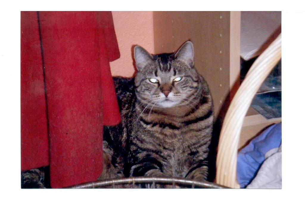 Whoops. Wrong picture. I'm still laughing about that. This is my sister's cat who got smeared in the last blog. (Hint about the quote reference: for those of you under 40, it's a movie called Hellraiser. Lots of gore, guts, stuff. It's kind of like parenthood except you get to eat highly buttered popcorn while you're watching everything around you explode.)Here we go. This is what would happen if I hadn't been in the house when Cressy decided to offload childhood baggage: