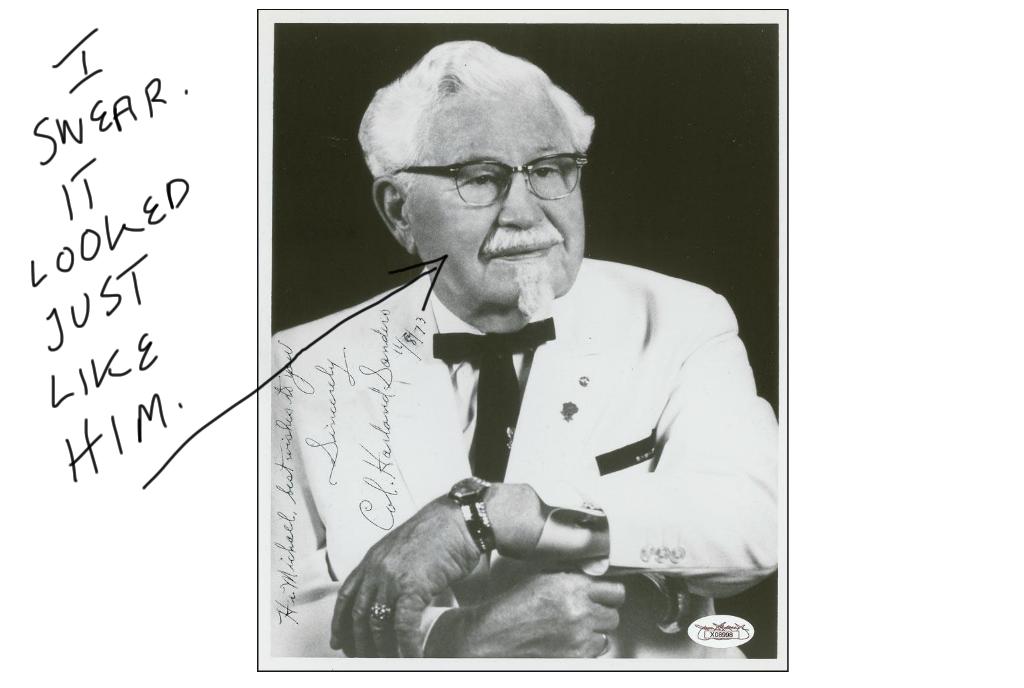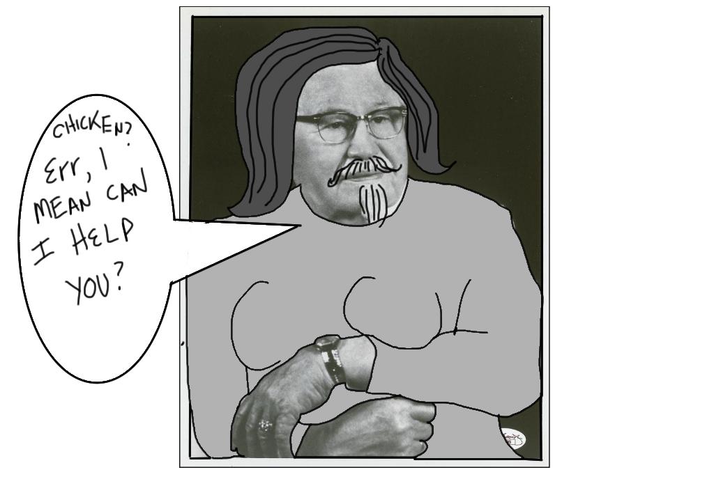 The receptionist had a very nice mustache, which was curly at the ends, and on the chin was a very nice goatee beard. It was even combed into a Colonel Sanders-like arrangement which a neat little curl at the end. I think Dippity-Do might have been used to achieve this effect.
