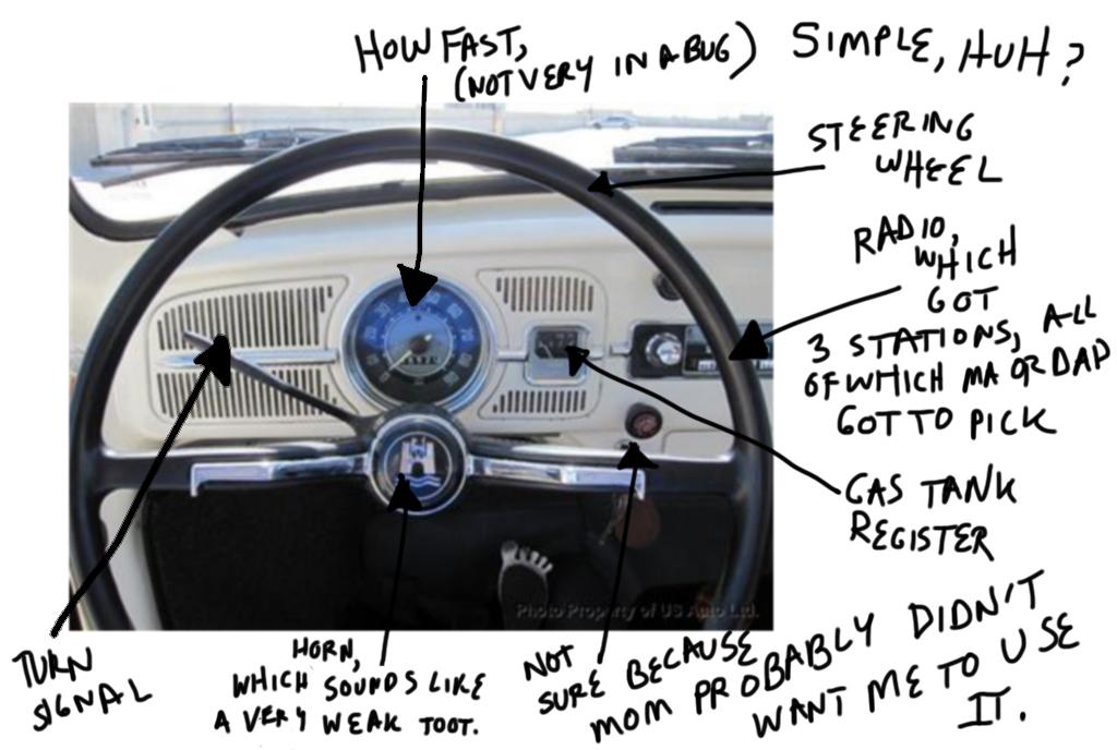 This could be the longest caption ever.While actually driving you could steer, honk, turn on the turn signal or turn it off, or you could shift gears and brake. This car certainly wasn't confusing. You pretty much could go or you could stop. There wasn't an option for automatic. Probably learning how to drive a manual clutch was the hardest part. But I've never forgotten and I can go between my automatic car which I've driven for 10 years and HIM's New Beetle, which has a five speed, without even thinking about it.