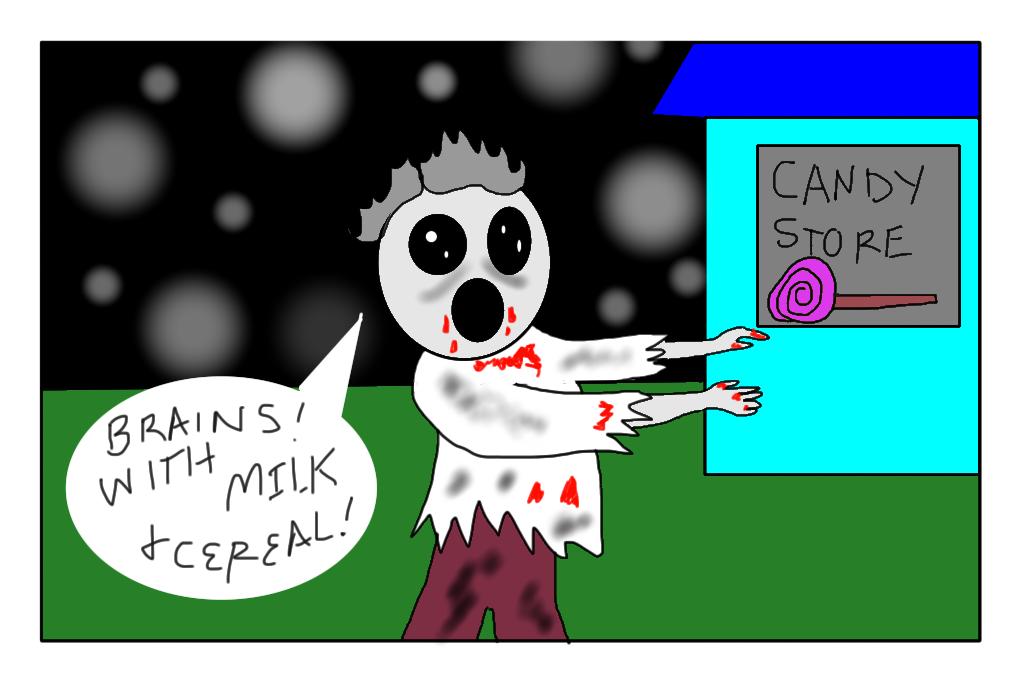 And I was specifically reinforced that candy zombies do eat brains but only with milk and cereal. There was no mention of what type of cereal was involved, but I suspect it was Captain Crunch or possibly Cheerios with 1% milk. (No Wheaties or Fat-Free Milk because those are gross-buckets.)