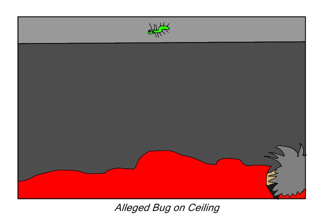 Not actual size except in my imaginationThere was an unidentifiable bug on my ceiling above my bed just as I was going to go to sleep. I didn't think this was a tenable situation. In fact, the bug didn't know it but I was about to Def-Con-1 it. You see, in my mind, an unidentifiable bug on my ceiling above my bed just as I was about to go to sleep could lead to only one situation. I will illustrate for I cannot NOT illustrate.