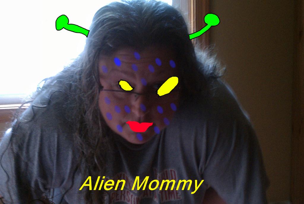 I love the blue spots on Fat Woman, er, Alien Mommy's face. Could be a strange, virulent space disease. (Man, are we obsessed with aliens and such.) (And can I interject that if we gave all the invading aliens our Brussels sprouts, broccoli, and cabbage, they wouldn't want to invade us anymore. I mean, isn't that a good point? Somebody call Barrack and let him in the know.)