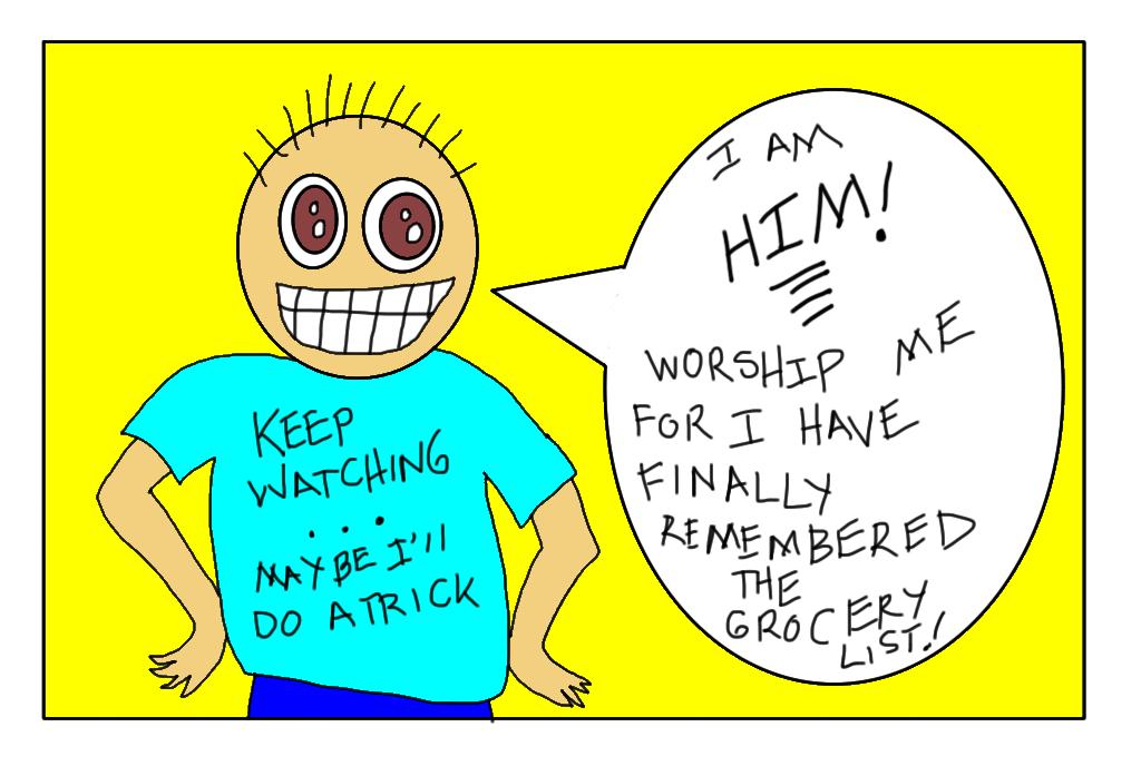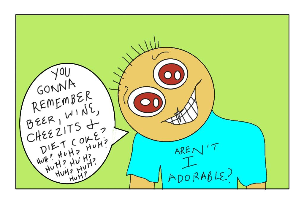 No, at this particular moment, he wasn't adorable.So was I thinking, 'Goodness Gracious Googly Woogly, I should be grateful that HIM remembered to remind me that he would like me to NOT FORGET to purchase beer, wine, Cheezits, and Diet Coke on my next shopping extravaganza.'? No, I was not thinking that. Also I was not thinking that all those snarky statements had finally borne fruit. "See, I remembered to add it to the list BEFORE the list was compiled and you went shopping," HIM might say in a cheerful and pert manner denoting his utter adorability. (Hey, I think I made up another word.) HIM might even run outside, pound his chest in a manly fashion and yell it to the neighbors, "I HAVE REMEMBERED BEFORE SHE GOES SHOPPING! I AM COMPLETE! HALLELUJAH!"