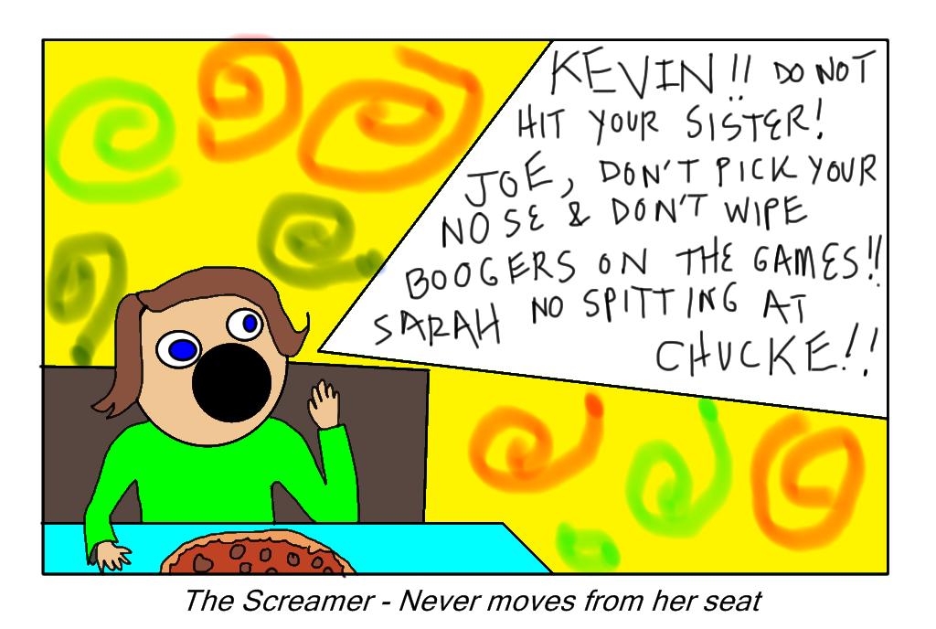 Then there was my personal favorite, the Screamer. This mommy has several kids in the restaurant, some of which are actually hers. She WILL NOT get up to go straighten anything out. Now don't get me wrong, the Screamer Mommy is not ignoring her children/wards/things to be watched. On the contrary, she is paying close attention to them, but she doesn't really want to get up and do anything. So she bellows. (She has special mommy voice powers that enable her to be heard over Chuck E. Cheese's robotic dancing mouse/rat music, other kids' screaming, and the sound of 20,000 games being played at the same time.) Everyone knows that the Screamer Mommy is present. (My God, they can hear her all the way down the street.)