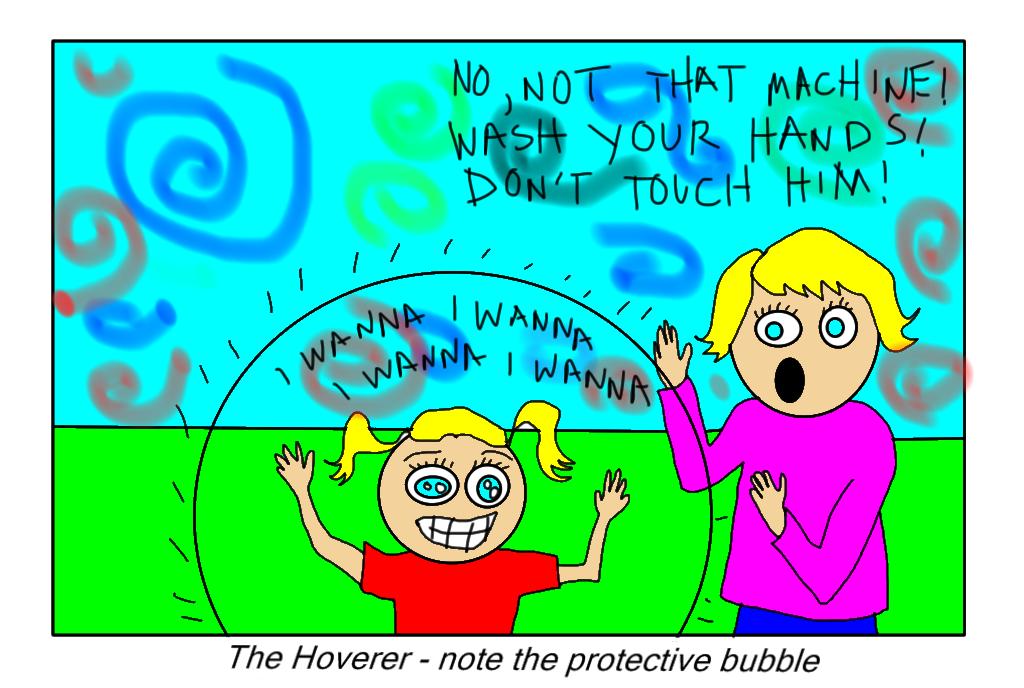 The first is the Hoverer. This mommy likes to stay by her child's side no matter what. I suspect that this mommy wouldn't even let their own grandma pick them up as an infant. This mommy is on the prowl for anything unsafe to their precious little angel and will ruthlessly safeguard their being. Pay particular attention to the protective bubble that has been formed around the child. (This child will grow up to be a serial killer or maybe a politician.)
