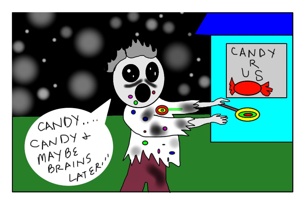 Yes, the candy zombie consumed every last bit of candy in the store. He shuffled happily off into the sunrise, wondering if he could find some early morning brains with milk and cereal. (Definitely not a bran cereal because that tastes like grass that someone threw into the bowl and farted on it. Possibly it had nuclear fall out too.)