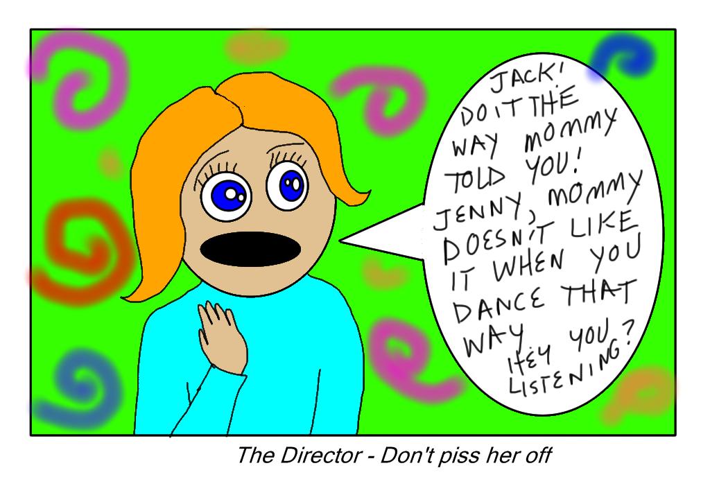 Space Mommy, which has nothing to do with this blog whatsoever.Okay, then onto characterization number 6. The Director. This mommy could be confused with the Hoverer, but they're actually quite distinct. While the Hoverer mommy seeks to protect her child from, pretty much, everything in existence, the Director wants to live vicariously through her child. Nothing that the child does is the correct way. This mommy wants the child to do everything mommy's way, no matter if mommy is nitpicking or not. The child can only play the games mommy's way. The child can only dress mommy's way. Don't you dare take off your scrunchy because mommy put it there. The Director Mommy can also be easily mistaken for the Screamer Mommy because of her yelling capacity but don't make that subtle error. The Director Mommy is large and in charge, kind of like Fat Woman. Not only does she want to be in control of her children, but she wants them to be mini-robotic versions of herself so that she can feel like a better person. Also the Director Mommy can be likened to the Godfather. She'll make you an offer you can't refuse and if you refuse you'll wake up in your bed with the head of one of your plush animals cut off.